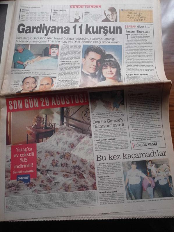 Sabah Gazetesi - 26 Ağustos 1998 - Alparslan Türkeş'in Sırları Yazı Dizisi - Trabzonspor UEFA'ya Erken Veda Etti - Fenerbahçe Göteborg'u Eledi - Elvir Baliç - Victoria's Secret - Arzum Onan - Mehmet Aslantuğ - Refah Partisi'nin Kayıp 1 Trilyonu Bulmak İçin Uzman Ekip Kuruldu - Fazilet Partisi Lideri Recai Kutan - Yeraltı Dünyasının 80'li Yıllardaki Etkili İsmi Bekir Çelenk - Güneş Taner'e Rus Basınından Övgü adlı eser, Kitap > Süreli Yayınlar > Gazeteler kategorisinde İkinci El olarak satıştadır.