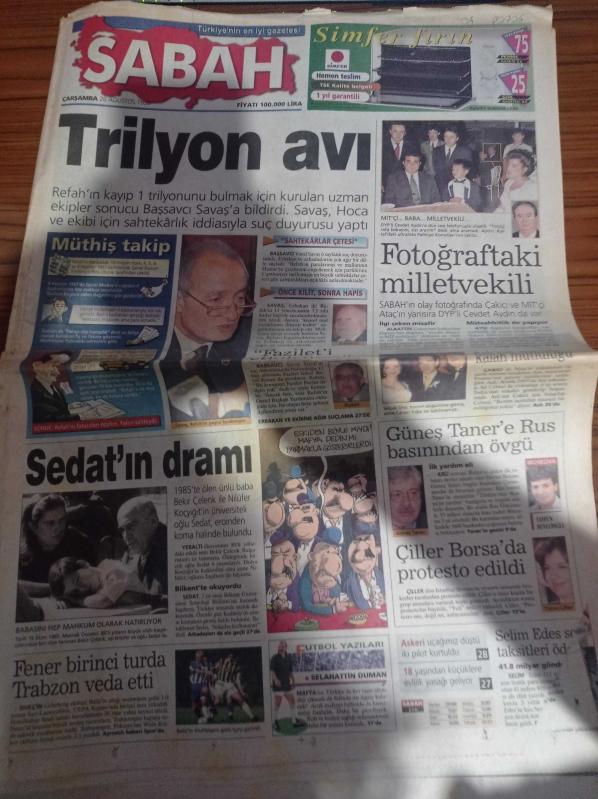 Sabah Gazetesi - 26 Ağustos 1998 - Yargıtay Başsavcısı Vural Savaş - Fantezi Seksi Besler - Alparslan Türkeş'in Sırları Yazı Dizisi - Trabzonspor UEFA'ya Erken Veda Etti - Fenerbahçe Göteborg'u Eledi - Elvir Baliç - Victoria's Secret - Arzum Onan - Mehmet Aslantuğ - Refah Partisi'nin Kayıp 1 Trilyonu Bulmak İçin Uzman Ekip Kuruldu - Fazilet Partisi Lideri Recai Kutan - Yeraltı Dünyasının 80'li Yıllardaki Etkili İsmi Bekir Çelenk - Güneş Taner'e Rus Basınından Övgü adlı eser Türkçe dilindedir.
