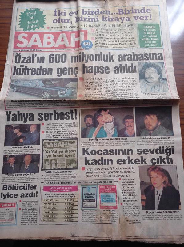 Sabah Gazetesi - 28 Mart 1986 - Semra Özal Türk Kalp Vakfı Üyesi Oldu - Simoviç Derwall Büyük Hoca Ama İviç Olsa Daha İyiydi - Boksör Eyüp Can Altın Madalya Kazandı - Simtel Milli Takım'a 9 Tekvandocu Verdi - Türkiye Vücut Geliştirme Şampiyonluğunu Tülay Bappert Kazandı - Kocasının Sevdiği Kadın Erkek Çıktı - Turgut Özal'ın 600 Milyonluk Arabasına Küfreden Genç Hapse atıldı adlı eser Türkçe dilindedir.