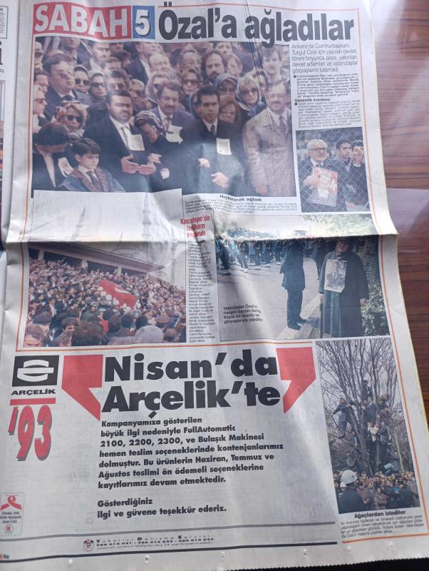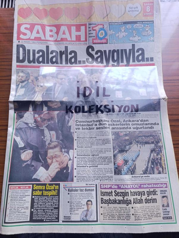 Sabah Gazetesi - Turkish Newspaper - 22 Nisan 199 - Turgut Özal'a dualarla saygıyla - Cumhurbaşkanı Turgut Özal Ankara'dan İstanbul'a Dün askerlerin omuzlarında ve tekbir sesleri arasında uğurlandı - Semra Özal'ın dayanağı artık oğulları Ahmet ve Efe ve kızı Zeynep Fotoğrafı - kulisler toz duman yazan Hasan Cemal - İsmet Sezgin havaya girdi başbakanlığa Allah derim - Cumhurbaşkanı Turgut Özal'ı İstanbul'a getiren uçakta sadece SABAH vardı fotoğraflar - Semra hanım hakkınızı helal edin dedi Çankaya'ya elveda Fotoğrafı - Kahraman Srebrenica Fotoğrafı - veda mektubu yazan Cengiz Çandar - Turgut Özal taziye ilanları - Mesut Yılmaz Anayol'a sıcak bakmadı - SHP'nin görüşü koalisyon Demirel'siz yürümez - Jetpa Yönetim kurulu Başkanı Fadıl Akgündüz Turgut Özal taziye ilanı - 900'lü hatlar ilanı - Alo Ben Hülya Avşar sizi tanımak istiyorum 900 hattı Fotoğrafı - ABD eski Dışişleri Bakanı James Baker Turgut Özal en iyi dostumuzdu - Turgut Özal'ın cenazesinde Elçibey ile Petrosyan yan yana Foto adlı eser, Kitap > Süreli Yayınlar > Gazeteler > Türkiye > Genel > Günlük kategorisinde İkinci El olarak satıştadır.