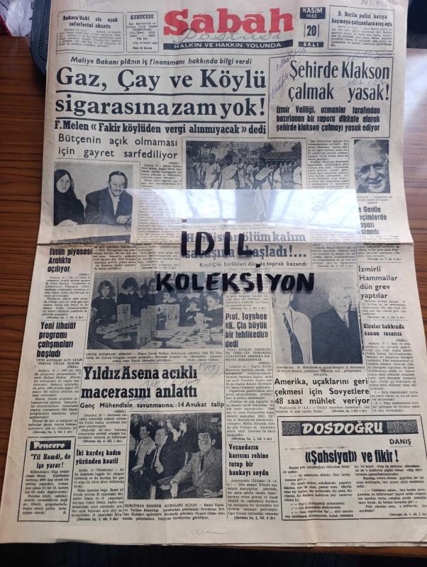 Sabah Postası Gazetesi - Turkish Newspaper - 20 Kasım 1962 - Gaz çay ve köylü sigarasına zam yok - Maliye Bakanı Ferit Melen fakir köylüden vergi alınmayacak dedi - İzmir'de klakson çalmak yasak - De Gaulle seçimlerde başarı kazandı - İzmirli hamallar Dün grev yaptılar - Hindistan ölüm kalım savaşına başladı - çocuk kitapları sergisi Fotoğrafı - İngiliz tarihçisi Toynbee Kızıl Çin büyük bir tehlikedir dedi - Yıldız Asena acıklı macerasını anlattı - Amerika uçaklarını geri çekmesi için Sovyetlere 48 saat mühlet veriyor - Zehra Abla yazan Hikmet Bozkurt Yazı Dizisi - şehir içinde belediye otobüsünün yolu kesildi - Eline ilk defa tüfek alan Miray Sözerman tecrübeli avcıları mağlup etti Fotoğrafı - Şeker gibi film ne şeker şey başrollerde Göksel Arsoy Türkan Şoray - turistik göl gazinosu şahane bir program açılıyor - Zorlu damat filmi başrolde Kadir Savun Cevat Kurtuluş köşk ve lale sinemalarında - Bytomlular 3. Tur Galatasaray'ın hakkıydı dedi - milli takımımız yarın gidiyor - Spartak adlı eser, Kitap > Süreli Yayınlar > Gazeteler > Türkiye > Genel > Günlük kategorisinde İkinci El olarak satıştadır.