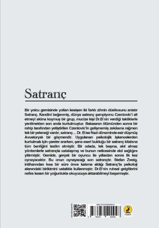 Satranç, Stefan Zweig tarafından kaleme alınmıştır. Kitap 2021 yılında Ceren Yayıncılık tarafından 978-605-9490-94-8 ISBN kodu ile yayınlanmıştır. Satışta olan kitap, yayınevinin 1. baskısıdır. Bu baskının çevirisi Emine Ümid Kurtiş tarafından yapılmıştır. 80 sayfadır. Satranç adlı eser Türkçe dilindedir.