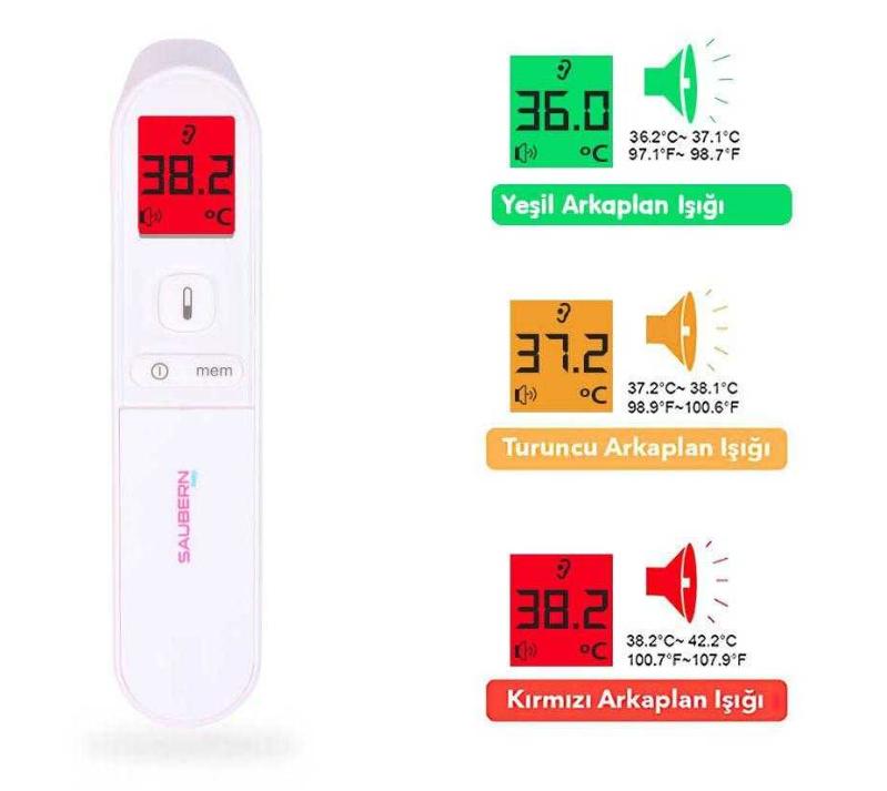 Saubern Baby BNT9602 Temassız Vücut ve Alından Ateş Ölçer Dinamik ortam ve vücut ısı değerlerini ölçmek üzere özel olarak tasarlanıp üretilmiştir Sadece kızılötesi sensörünü kullanarak sürekli doğru ölçüm yapabilme özelliğine sahiptir Duruma(isteğe) göre Fahrenayt(F) veya Selsilus(C) ölçümü yapabilir. Otomatik olarak kapanma özelliği vardır. Kızılötesi çalışma prensibine dayalı çalışır ve kızıl ötesi ile insan vücudunun ısısını ölçer. Vücut sıcaklığı ölçümü Nesne sıcaklığı ölçümü 50 ölçüm hafızası Temassız 1 saniyede değer okuma Farklı vücut sıcaklığına göre değişken ekran göstergesi Sesli olarak yüksek ateş uyarısı verir. Otomatik kapanma