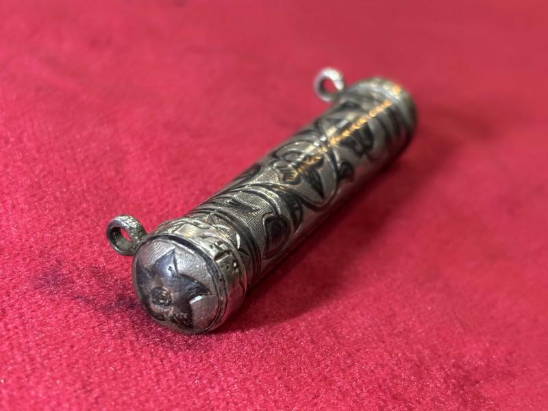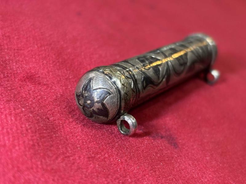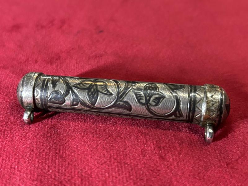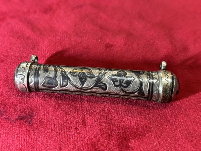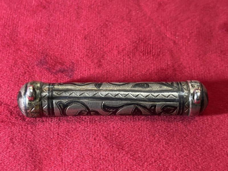 Savat işçilikli gümüş hamayıl 17 gram ağırlığında 7,5 cm boyunda başlıklı antika/koleksiyon objesi Avrupa menşe’lidir. 1900-1949 arası dönemine aittir.