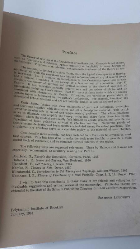 Schaum's Outlines Series Theory and Problems of SET THEORY and RELATED TOPICS.. İncluding 530 solved problems.. Seymour Lipschutz - (first print ©1964), SEYMOUR LIPSCHUTZ (1931- 2018) tarafından kaleme alınmıştır. Eser Serie developed: Daniel Schaum (1913-2008) editörlüğünde hazırlanmıştır. Kitap 1964 yılında McGRAW-HILL, 1964 tarafından [NEW YORK] 070379866 ISBN kodu ile yayınlanmıştır. Satışta olan kitap, yayınevinin 1. baskısıdır. 233 sayfadır. Schaum's Outlines Series Theory and Problems of SET THEORY and RELATED TOPICS.. İncluding 530 solved problems.. Seymour Lipschutz - (first print ©1964) adlı eser İngilizce dilindedir.
