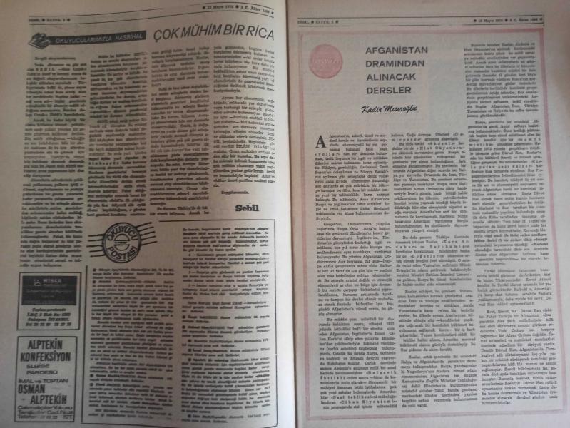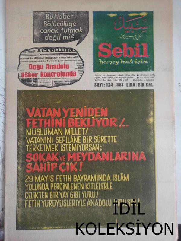 Sebil Haftalık Siyasi, Edebi, Tarihi, İlmi Gazetesi - 12 Mayıs 1978 - Sayı:124 - Bu Haber Bölücülüğe Çanak Tutmak Değil Mi? - Vatan Yeniden Fethini Bekliyor! - Sokak ve Meydanlarına Sahip Çık! - Çok Mühim Bir Rica - Afganistan Dramından Alınacak Dersler - Kadir Mısıroğlu - Yakın Tarihimizde Meçhul Kahramanlar - Lütfi Fikri Bey - Kadir Mısıroğlu - Ahmed Selami - Kemmiyet, Demokrasi Putuyla Beslendikçe Keyfiyet Yaşatılamayacaktır - 1 Mayıs Yortusunun Söylettikleri - İslam Milleti! Anadolu Birliğini Yeniden Kurmalısın! - Selahaddin Es - Bulgar Dostluğu Ha? - Dediler Dedik Ki - İslam Konferansları Tevsatıldı Mı? - Burma Müslümanları Ve... - Bayrak Kelimeler - Dil ve Edebiyat - Rus Emperyalizmi ve Kuzey Kafkasya Meselesi - İslam'da Sakalın Hükmü - Sırası Geldikçe - Nefs Muhasebesi Mecburiyeti - Orhan Tüz - İslam Yazısına Dair - Sadık Özarslan - Hazır Mıyız? - Lütfen Gurbetzede Kardeşler, Lütfen - Moskof Afganistanı Yuttu fotoğraf ve haberi - Tam Takım Gazete Yıpranma, sararmalar, kupon kesiği ve yırtılmalar zamana bağlı olarak görülebilir