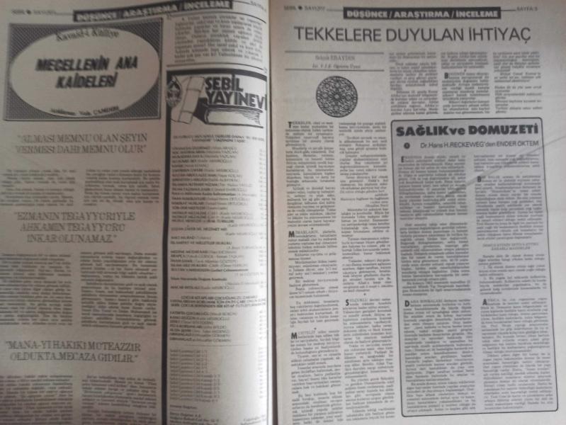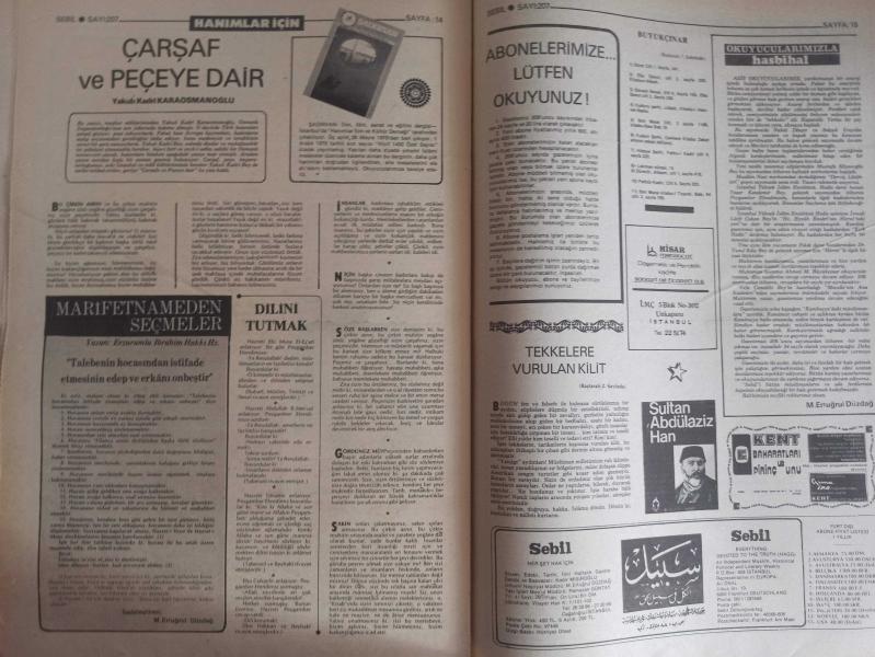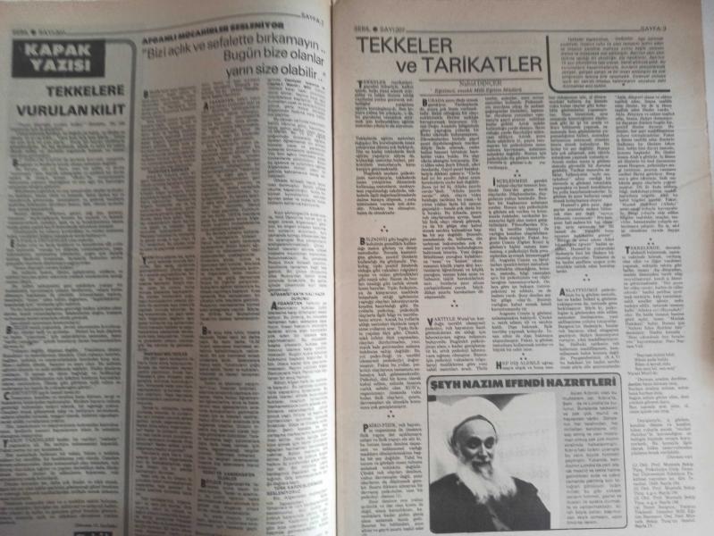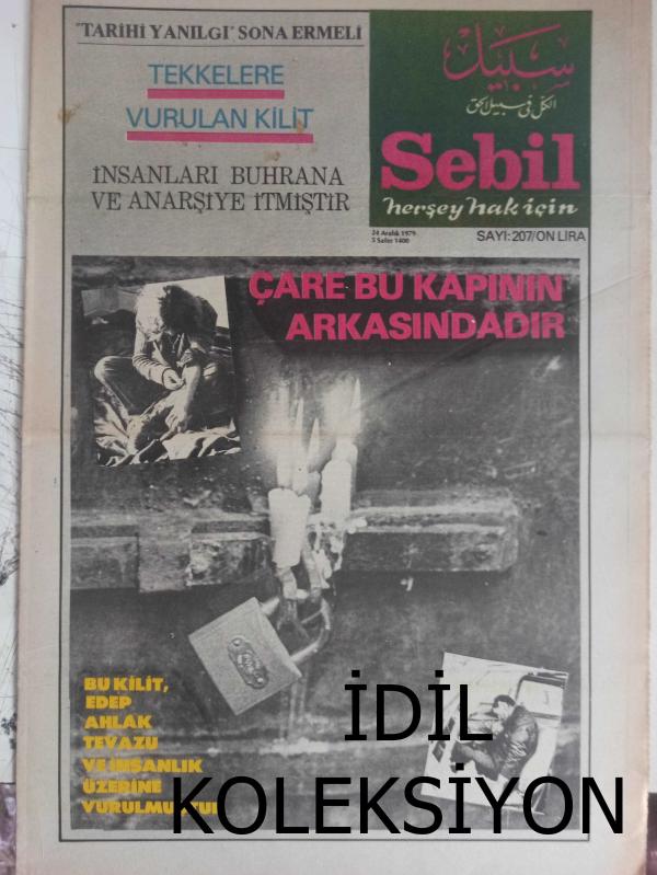 Sebil Haftalık Siyasi, Edebi, Tarihi, İlmi Gazetesi - 24 Aralık 1979 - Sayı:207 - Tekkelere Vurulan Kilit - İnsanları Buhrana ve Anarşiye İtmiştir - Çare Bu Kapının Arkasındadır - Tekkeler ve Tarikatler - Şeyh Nazım Efendi Hazretleri - Mecellenin Ana Kaideleri - Tekkelere Duyulan İhtiyaç - Sağlık ve Domuz Eti - Ender Öktem- Ölçülerimiz Ticaret - Kırk Hadis - Büyük Günahlar - Dini Suallere Cevaplar - Ahmed Muhtar Büyükçınar - 1399 Hac İntibaları - Ahmed Abid - Mustafa Mıyasoğlu - Fevzi Bektaş Şehid Oldu - KEm Kalemler - Aydınlarımız Uyanıyor mu? - Mevleviler Serbest, Ya Ötekiler - Silaha Karşı İnanç ve İhlas - Cahilliğe Razıyız - Hatsan'atı Ma'kili Yazı - Sebiller - Osmanlı Ruhunun Taş'a Akisleri - Kılıç Ali Paşa Sebili - Şehid Çocuk - Peygamber'in Kuvveti - Çocuklarla Dost Sohebtleri - Ya Muhammed - Çarşaf ve Peçeye Dair - Yakup Kadri Karaosmanoğlu - Dilini Tutmak - Hasbihal - Kamboçya'da Müslümanlar fotoğraf ve haberi - Tam Takım Gazete Yıpranma, sararmalar, kupon kesiği ve yırtılmalar zamana bağlı olarak görülebilir
