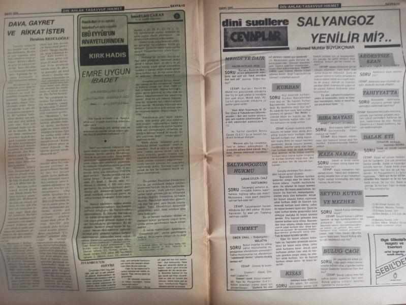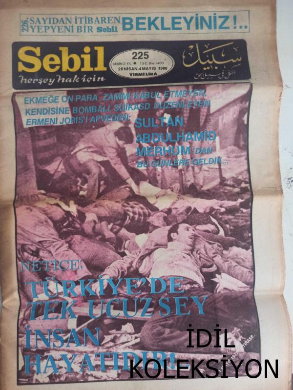Sebil Haftalık Siyasi, Edebi, Tarihi, İlmi Gazetesi - 25 Nisan - 4 Mayıs 1980 - Sayı:225 - Türkiye'de Tek Ucuz Şey İnsan Hayatıdır! - Okuyucu Postası - Ermeni Meselesi'ndeki Yeni Kıpırdanışların Sebepleri - Kadir Mısıroğlu - Güneş Batıdan Doğuyor - Batı'da Şuurlanan Eski Müslümanlar - Ahmet Paşa'nın Bir Gazeli - Mustafa Miyasoğlu - Müslümanlara Kimler ''Başkan'' Olabilir - Talha Emiroğlu - Faiz - Bir İbret Levhası - Ermeniler Bizi Arkadan Hançerlemeye Kalkıştıklarını Unutuyorlar - Dava, Gayret ve Rikkat İster - İbrahim Resuloğlu - Dini Suallere Cevaplar - Salyangoz Yenilir mi? - Ahmed Muhtar Büyükçınar - Bayezid-i Veli Han Türbesinde - Mine Alpay - Kadınlara Hitab - İmtihan - Örovizyon Mesajı - Komünistler Dinsizdir! - Hiç Olmazsa Cuma Günleri Camiden İçeriye Ayak Atan Bir Reisicumhur - Muhsin Batur - Saadettin Bilgiç - Necmettin Erbakan fotoğraf ve haberi - Tam Takım Gazete Yıpranma, sararmalar, kupon kesiği ve yırtılmalar zamana bağlı olarak görülebilir