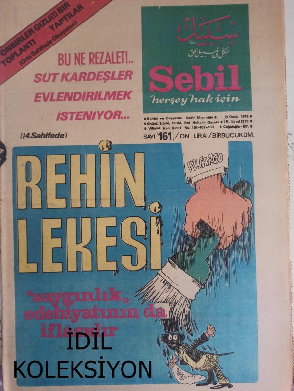 Sebil Haftalık Siyasi, Edebi, Tarihi, İlmi Gazetesi - 29 Ocak 1979 - Sayı:161 - Bu Ne Rezalet Süt Kardeşler Evlendirilmek İsteniyor - Rehin Lekesi Saygınlık Edebiyatının da İflasıdır - Okuyucu Sesi - Böyleleri de Var! - Tarih Perspektifi - Kadir Mısıroğlu - Yakın Tarihimizde Meçhul Kahramanlar - Kur'an Pınarı - Şeytan Azapta Gerek - Mustafa Yazgan - 19. Asrın Yüzkarası - Sedad Zeki Örs - Müslümanda Vahdet Şuurunun Teşekkülü - İngiliz Casusu Lawrence - İslam'ın İstediği Genç Nasıl Olmalıdır? - Hadislerin Işığında Günümüz - Onbirler Gizli Bir Toplantı Yaptılar - Bu ne Rezalet - Komünizm'in Hedefi - Muhammed'in Yüce Şahsiyeti - İktisad - Fıkıh Köşesi - Esma-ül Hüsna - Prof. Mehmed Ali Aynı - Sevde Binti Zema - Sebil Yayınevi - İslam Yazısı Çeşitleri - Talik Hattı - Sadık Özarslan - Kazım Karabekir Paşa - Zirai Mahsullerimiz Rehin Edildi - Okuyucu Postası - Necmeddin Erbakan Avrupa'da - Laiklik Ne Zamana Kadar İslam Düşmanlığı Şeklinde Tatbik Edilecek fotoğraf ve haberi - Tam Takım Gazete Yıpranma, sararmalar, kupon kesiği ve yırtılmalar zamana bağlı olarak görülebilir