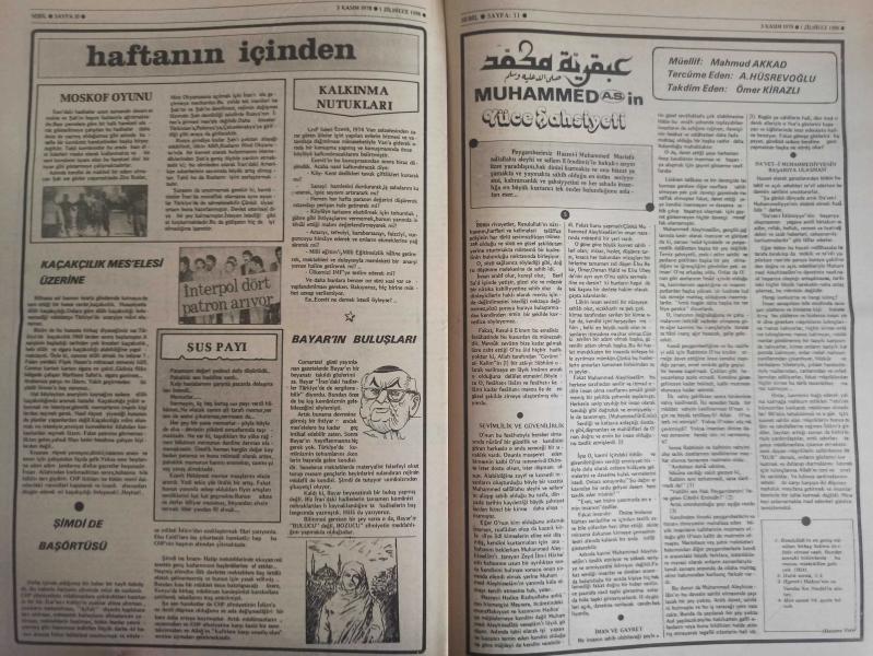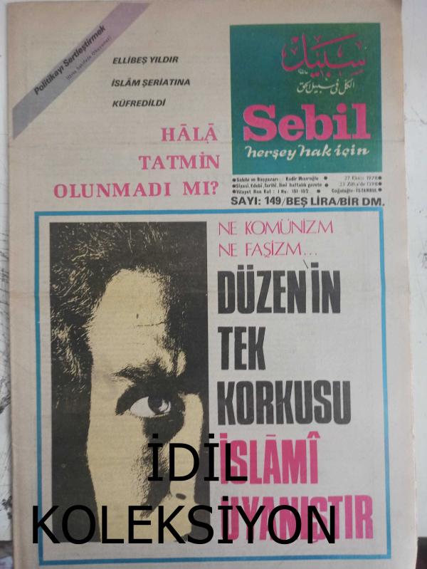 Sebil Haftalık Siyasi, Edebi, Tarihi, İlmi Gazetesi - 4 Kasım 1978 - Sayı:149 - 55 Yıldır İslam Şeriatına Küfür Edildi; Hala Tatmin Olunmadı mı? - Ne Komünizm Ne Faşizm Düzen'in Tek Korkusu İslami Uyanıştır - Meslek Seçiminin Tesadüfe Terkedilmiş Olmasındaki Vahamet - Kadir Mısıroğlu - Yakın Tarihimizde Meçhul Kahramanlar - Mustafa Yazgan - Bir Yangın İçindeyiz - MSP Genişletilmiş İl Davanı İstanbul'da Yapıldı - Ziya Gökalp'in Hayatı ve Eserleri - Cemil Meriç - Turancılık - Allah Ordusu'nun Kültürel ve Ahlaki Vasıfları - Ali Rıza Vasıfları - Temcid Pilavı - AP-CHP Koalisyonu - Faiz Yasak - Politikayı Sertleştirmek - Haftanın İçinden - Moskof Oyunu - Kalkınma Nutukları - Bayar'ın Buluşları - Hazreti Mühammed'in Yüce Şahsiyeti - Milli Mücadele ve Karaisali Müftüsü Hacı Mehmed Aldatmaz - Veli Ertan - Bayram Mesajları - İslam Yazısı Çeşitlerinden Makılı Hattı - Ömer Saba Bostan - Sadık Özarslan - İnancımızı Müdafaa Edemeyecek Miyiz? - Ali Tarikatların Me'hazı - Risale-i Esadiye - Nobel Barış Mükafatı ve Sedad - Endonezya'da Müslümanların Baş Kaldırışı fotoğraf ve haberi - Tam Takım Gazete Yıpranma, sararmalar, kupon kesiği ve yırtılmalar zamana bağlı olarak görülebilir