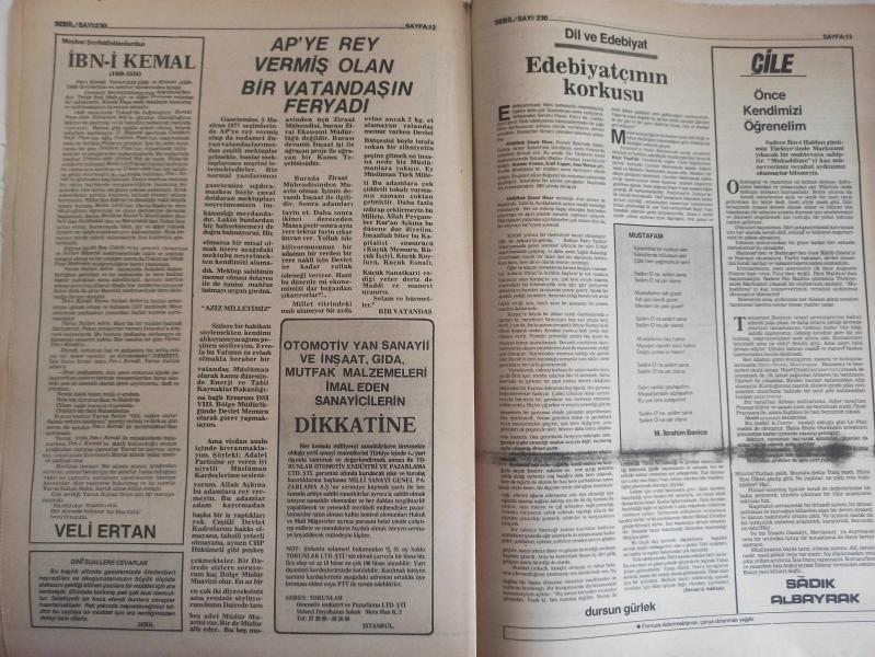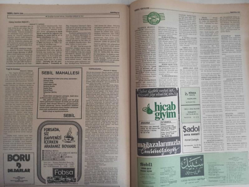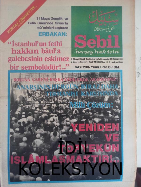 Sebil Haftalık Siyasi, Edebi, Tarihi, İlmi Gazetesi - 5 Haziran 1980 - Sayı:230 - İstanbul'un Fethi Hakkın Batıla Galbesinin Eskimez Bir Sembolüdür! - Yeniden ve Topyekün İslamlaşmaktır! - Anarşinin Şumulü ve Nihai Hedefi - Devlet ve Karını Korumak - Türkçe Kur'an Olmaz -Ali Nar - İlmi Kelam - Fildişi Kuleden - Yogi ile Komiser - Cemil Meriç - Kur'an Kendi Dilince Kur'andır. Başka Dile Çevrilişi Sadece Mealdır. Ve Sadece Eksik Manadan İbaretir - Edebiyat Ahlakı - Mustafa Miyasoğlu - İslam'ın Hakimiyeti İçin Çalışmalıyız - Kürtaj Bir Cinayettir - Anarşi Tırmanıyor - Sivas Tarihi Bir Gün Yaşadı - MSP Umumi Reisi Erbakan - Ben Şahsen Son Nefesimi Bir Minare Gölgesinde Vermek İstiyorum - İbn-i Kemal - Vel-i Artan - AP'ye Rey Vermiş Olan Bir Vatandaşın Feryadı - Edebiyatçının Korkusu - Dursun Gürlek - Sadık Albayrak - Önce Kendimizi Öğrenelim - Sebil Mahallesi - Okuyucu Postası - Fethin 527. Yılında İslam'cı Gençlik Bir Kere Daha Şahlandı fotoğraf ve haberi - Tam Takım Gazete Yıpranma, sararmalar, kupon kesiği ve yırtılmalar zamana bağlı olarak görülebilir