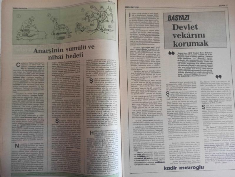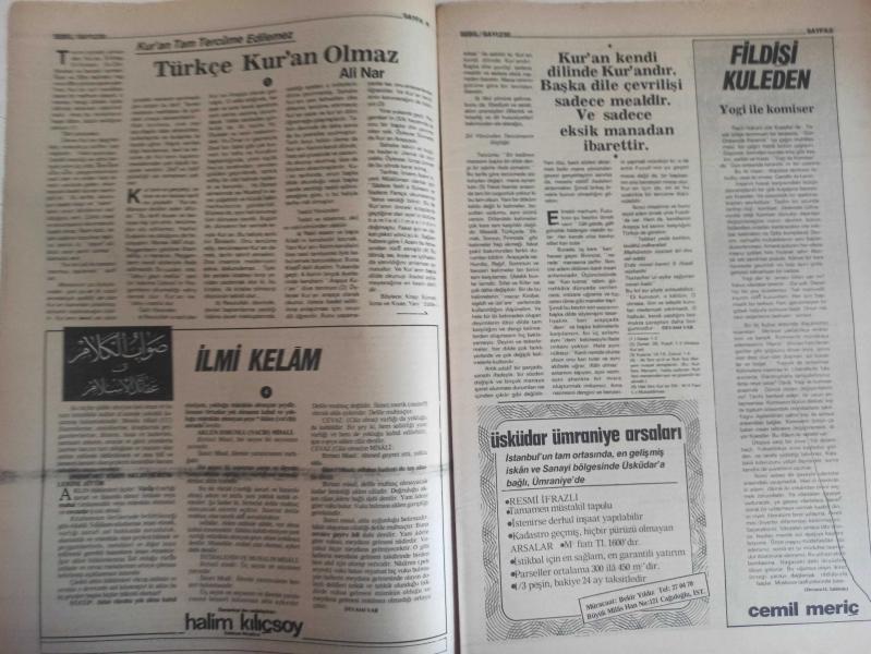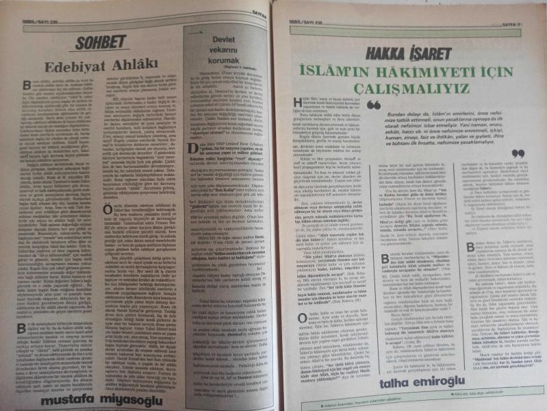 Sebil Haftalık Siyasi, Edebi, Tarihi, İlmi Gazetesi - 5 Haziran 1980 - Sayı:230 - İstanbul'un Fethi Hakkın Batıla Galbesinin Eskimez Bir Sembolüdür! - Yeniden ve Topyekün İslamlaşmaktır! - Anarşinin Şumulü ve Nihai Hedefi - Devlet ve Karını Korumak - Türkçe Kur'an Olmaz -Ali Nar - İlmi Kelam - Fildişi Kuleden - Yogi ile Komiser - Cemil Meriç - Kur'an Kendi Dilince Kur'andır. Başka Dile Çevrilişi Sadece Mealdır. Ve Sadece Eksik Manadan İbaretir - Edebiyat Ahlakı - Mustafa Miyasoğlu - İslam'ın Hakimiyeti İçin Çalışmalıyız - Kürtaj Bir Cinayettir - Anarşi Tırmanıyor - Sivas Tarihi Bir Gün Yaşadı - MSP Umumi Reisi Erbakan - Ben Şahsen Son Nefesimi Bir Minare Gölgesinde Vermek İstiyorum - İbn-i Kemal - Vel-i Artan - AP'ye Rey Vermiş Olan Bir Vatandaşın Feryadı - Edebiyatçının Korkusu - Dursun Gürlek - Sadık Albayrak - Önce Kendimizi Öğrenelim - Sebil Mahallesi - Okuyucu Postası - Fethin 527. Yılında İslam'cı Gençlik Bir Kere Daha Şahlandı fotoğraf ve haberi - Tam Takım Gazete, Kadir Mısıroğlu - Ramazan Güntay tarafından kaleme alınmıştır. Kitap 1980 yılında Milsan Basın Sanayi tarafından [İstanbul] yayınlanmıştır. 16 sayfadır. Sebil Haftalık Siyasi, Edebi, Tarihi, İlmi Gazetesi - 5 Haziran 1980 - Sayı:230 - İstanbul'un Fethi Hakkın Batıla Galbesinin Eskimez Bir Sembolüdür! - Yeniden ve Topyekün İslamlaşmaktır! - Anarşinin Şumulü ve Nihai Hedefi - Devlet ve Karını Korumak - Türkçe Kur'an Olmaz -Ali Nar - İlmi Kelam - Fildişi Kuleden - Yogi ile Komiser - Cemil Meriç - Kur'an Kendi Dilince Kur'andır. Başka Dile Çevrilişi Sadece Mealdır. Ve Sadece Eksik Manadan İbaretir - Edebiyat Ahlakı - Mustafa Miyasoğlu - İslam'ın Hakimiyeti İçin Çalışmalıyız - Kürtaj Bir Cinayettir - Anarşi Tırmanıyor - Sivas Tarihi Bir Gün Yaşadı - MSP Umumi Reisi Erbakan - Ben Şahsen Son Nefesimi Bir Minare Gölgesinde Vermek İstiyorum - İbn-i Kemal - Vel-i Artan - AP'ye Rey Vermiş Olan Bir Vatandaşın Feryadı - Edebiyatçının Korkusu - Dursun Gürlek - Sadık Albayrak - Önce Kendimizi Öğrenelim - Sebil Mahallesi - Okuyucu Postası - Fethin 527. Yılında İslam'cı Gençlik Bir Kere Daha Şahlandı fotoğraf ve haberi - Tam Takım Gazete adlı eser Türkçe dilindedir.