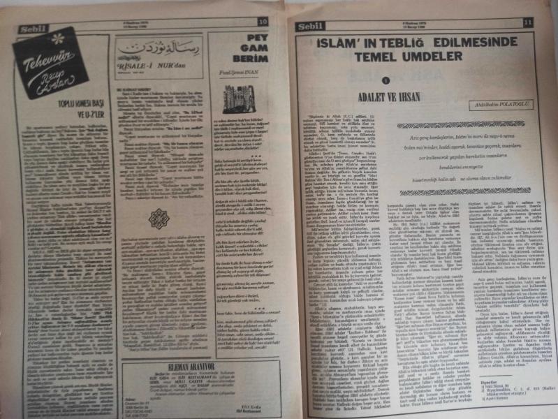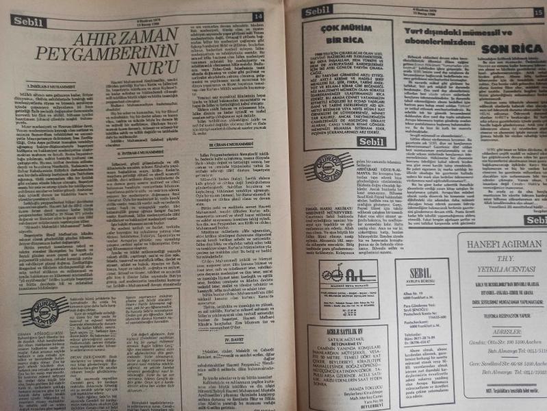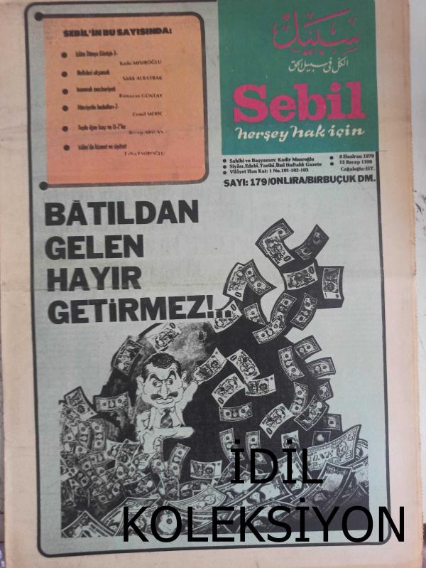 Sebil Haftalık Siyasi, Edebi, Tarihi, İlmi Gazetesi - 8 Haziran 1979 - Sayı:179 - Batıldan Gelen Hayır Getirmez! - İslamcı Sinemanın Öncüsü Mesut Uçakan, Kendi Yapımı ''Lanet'' Filmi ile Birlikte Kuveyt'e Gitti - İslam Dünya Görüşü - Kadir Mısıroğlu - Yakın Tarihimizde Meçhul Kahramanlar - Deli Halid Paşa - Mustafa Yazgan - Ruh ve Ceset - Nefileri Okşamak - Sadık Albayrak - Hürriyetin Hudutları - Cemil Meriç - İnanmak Mecburiyeti - İslam'a Hizmet ve Siyaset - Talha Emiroğlu - Müslüman Türk'ün Hac İbadetine Mani Olunmak İsteniyor! - Cami Önünde İmamlara Tecavüze Cüret Ediliyor - Recep Arslan - Toplu İğnesi Başı ve U-2'ler - İslam'ın Tebliğ Edilmesinde Temel Umdeler - Adalet ve İhsan - Kadın: Tahsil İş Aşk ve Aile - Mücahideler Sizler İçin - Romantizm Realizm - Esma-ül Hüsna - Hadislerin Işığında - Kin Duvarları - Balık Özarslan - Ahır Zaman Peygamberinin Nur'u - Yurt Dışındaki Mümessil ve Abonelerimizden Son Rica - Erbakan, Yozgat'da, İslamcı Gençliğe Hitabetti fotoğraf ve haberi - Tam Takım Gazete Yıpranma, sararmalar, kupon kesiği ve yırtılmalar zamana bağlı olarak görülebilir