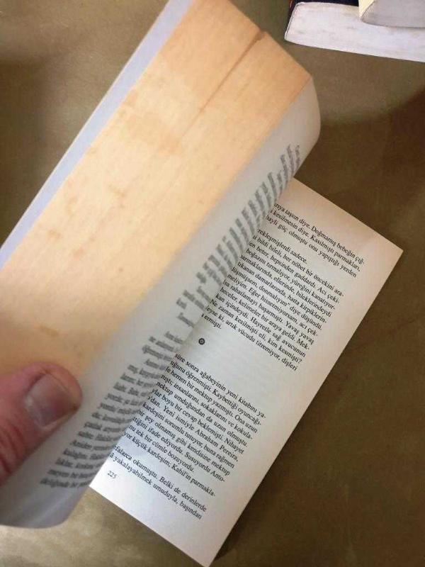 Sayfa uçlarında içe taşmayan lekelenme ve sayfalarda hafif sararma vardır.
