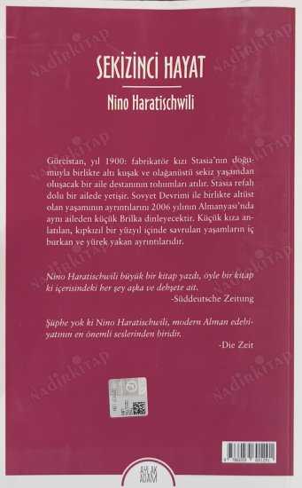 Sekizinci Hayat, Nino Haratischwili tarafından kaleme alınmıştır. Kitap 2017 yılında Aylak Adam tarafından [İstanbul] yayınlanmıştır. 792 sayfadır. Sekizinci Hayat adlı eser Türkçe dilindedir.