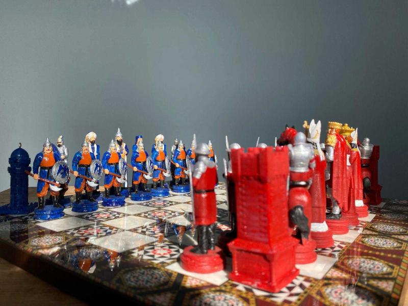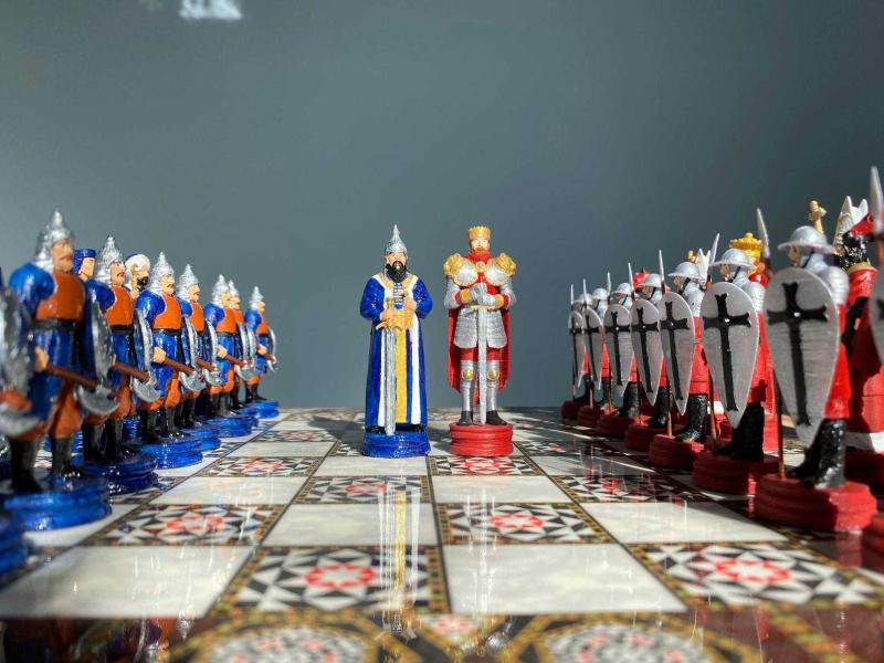 Bu özel tasarım satranç takımı, Selçuklu Devleti ve Bizans İmparatorluğu mücadele döneminin tarihi figürlerinden ilham alınarak üretilmiştir. 🔹 Taşlar: Polimer malzeme – elde boyanmış – yüksek detaylı 🔹 Taş yüksekliği: 8 cm 🔹 Tahta: Masif ahşap – 37x37 cm ölçülerinde 🔹 Toplam ağırlık: 2 kg 🔹 Renk: Mavi-Kırmızı 🔹 Kutusunda gönderilir ✔️ Oyuncular için dengeli ağırlık ✔️ Dekoratif olarak vitrin, ofis ya da kütüphane için ideal ✔️ Özel günlerde hediye olarak tercih edilebilir (Babalar Günü, terfi hediyesi, koleksiyonluk vb.) ❗ Sadece sınırlı sayıda üretildi. Stoklar tükenmeden sahip olun.