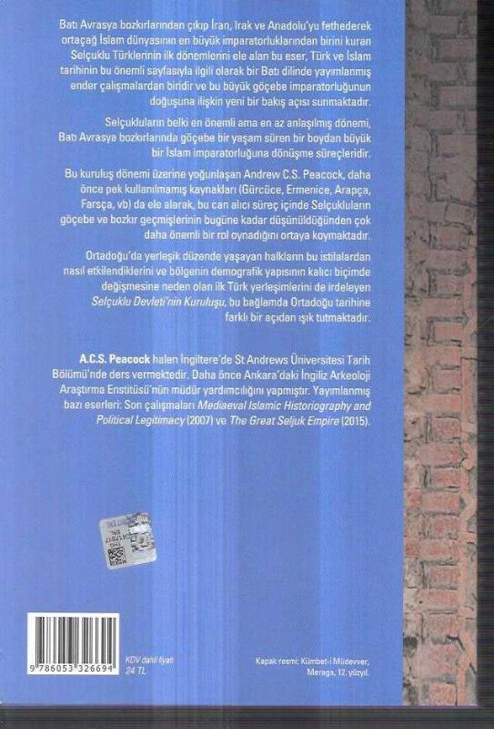 Selçuklu Devleti'nin Kuruluşu yeni bir yorum, A. C. S. Peacock tarafından kaleme alınmıştır. Kitap 2016 yılında Türkiye İş Bankası Kültür Yayınları tarafından [İstanbul] yayınlanmıştır. Bu baskının çevirisi Zeynep Rona tarafından yapılmıştır. 260 sayfadır. Sayfa bilgisi 2. hamur olarak belirtilmiştir. Selçuklu Devleti'nin Kuruluşu yeni bir yorum adlı eser Türkçe dilindedir.