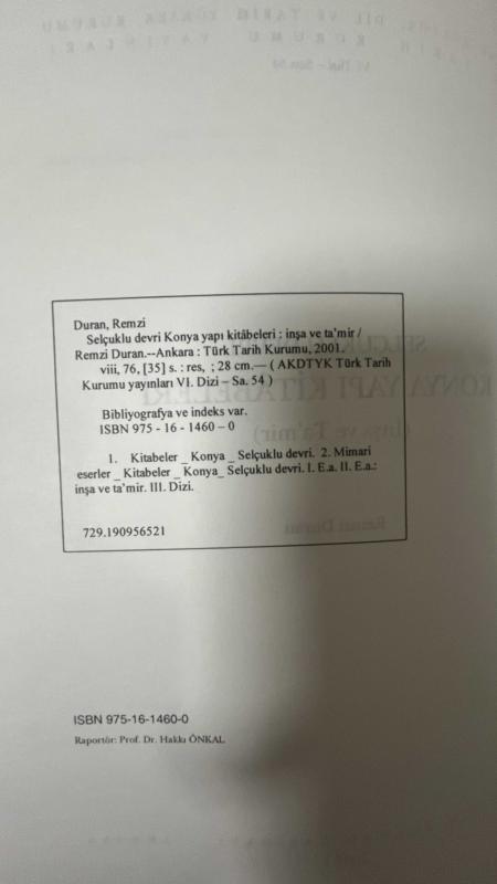 Selçuklu Devri Konya Yapı Kitabeleri (İnşa ve Ta'mir) - Remzi Duran - Türk Tarih Kurumu Yayınları, Remzi Duran tarafından kaleme alınmıştır. Kitap 2001 yılında Türk Tarih Kurumu Yayınları tarafından [Ankara] 9751614600 ISBN kodu ile yayınlanmıştır. Satışta olan kitap, yayınevinin 1. baskısıdır. 90 sayfadır. Sayfa bilgisi 1. Hamur olarak belirtilmiştir. Selçuklu Devri Konya Yapı Kitabeleri (İnşa ve Ta'mir) - Remzi Duran - Türk Tarih Kurumu Yayınları adlı eser Türkçe dilindedir.