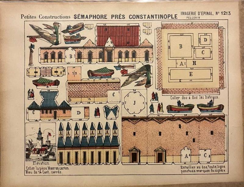 Bu çalışma, 19. yüzyıl sonu Fransa’sında yayımlanmış Kızkulesine ait bir kâğıt maket (paper model) sayfasıdır ve çok nadirdir. • Başlık: Petites Constructions – Sémaphore près Constantinople (“Küçük İnşaatlar – İstanbul (Konstantinopolis) yakınlarında bir semafor istasyonu”) • Seri: Imagerie d’Épinal • Numara: No. 1213 • Yayınevi: Pellerin & Cie, Imagerie d’Épinal (Fransa) • Yer: Épinal, Vosges, Fransa • Tarih: 1890’lar civarı Imagerie d’Épinal, 18. yüzyıldan itibaren Fransa’nın Vosges bölgesinde faaliyet gösteren bir popüler görsel basımevidir. Bu yayınevi, renkli taşbaskı (lithographie) tekniğiyle eğitici, eğlencelik ve dekoratif baskılar üretmiştir. Bu tür “Petites Constructions” (Küçük Maketler) serisi, çocukların makasla kesip karton üzerine yapıştırarak üç boyutlu modeller oluşturmalarını amaçlayan bir tür erken dönem oyuncak/öğretici maket dizisidir. Bu özel örnekte, Osmanlı İmparatorluğu döneminde İstanbul yakınlarında bir deniz işaret kulesi (semafor kulesi) yani Kızkulesi betimlenmiştir. Baskı türü: Renkli taşbaskı (chromolithographie) • Kâğıt: Orta gramajlı, hafif sararmış elyaftan üretilmiş kâğıt • Boyut (yaklaşık): 30 x 25 cm civarı • Renkler: Tipik Pellerin paleti — mavi, kırmızı, sarı, bej ve siyah tonlar • Durum: oldukça iyi korunmuş durumda — kesilmemiş, yırtıksız ve ton eşitliği yüksek. koleksiyon değeri açısından önemlidir.