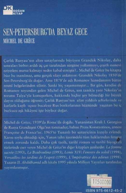 Sen Petersburg'da Beyaz Gece, Michel de Grece tarafından kaleme alınmıştır. Kitap 2001 yılında Doğan Kitap tarafından yayınlanmıştır. 310 sayfadır. Sen Petersburg'da Beyaz Gece adlı eser Türkçe dilindedir.