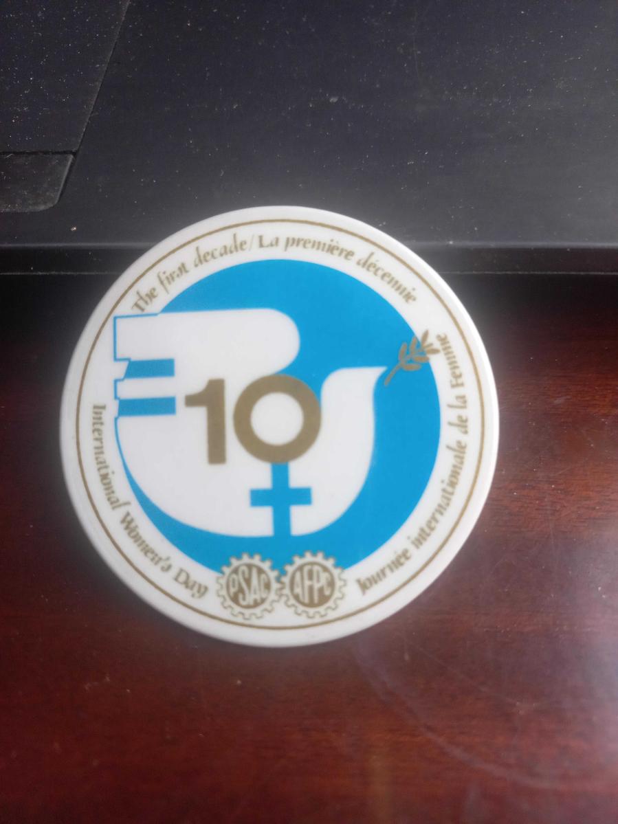 Sendika logolu seri nolu 5 cm çapında Birleşmiş Milletler tarafından ilan edilen 1975 Uluslararası Kadınlar Yılı'na ait rozet çok nadir başlıklı antika/koleksiyon objesi Amerika menşe’lidir. 1960-1979 arası dönemine aittir.