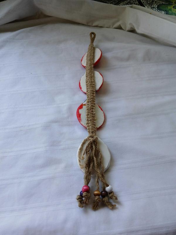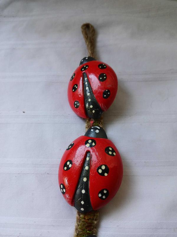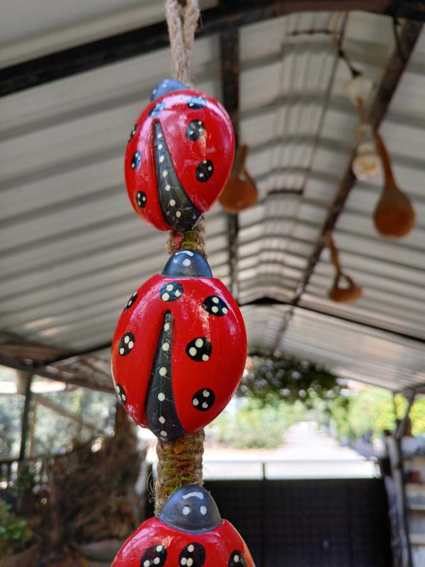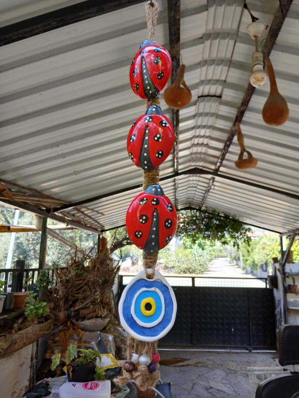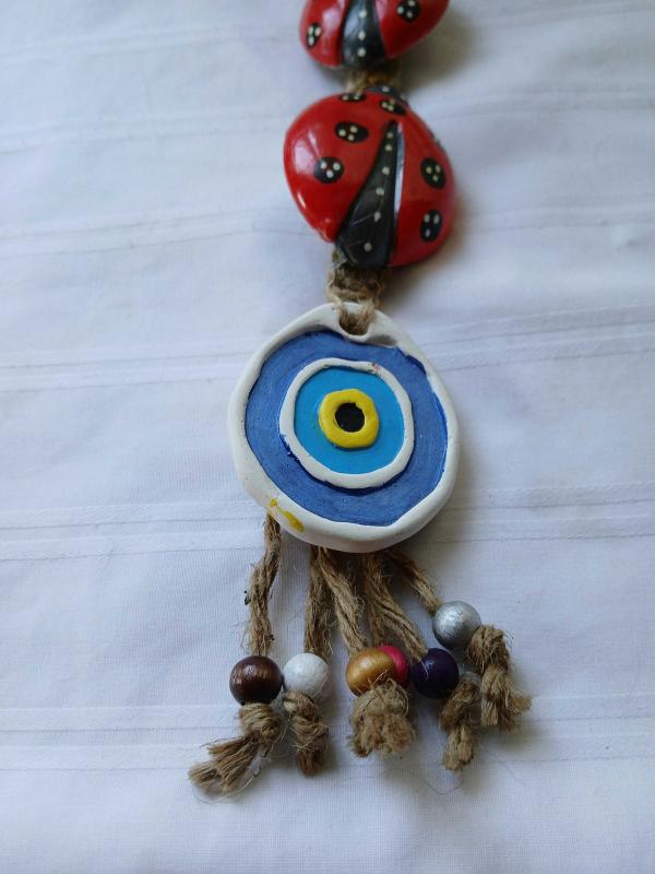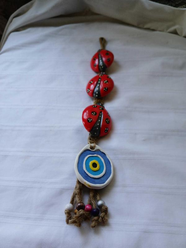 Seramikten yaptığım 3 Uğur böceği ve nazar boncuklu dekoratif balkon veya bahçe aksesuarı ölçüleri:(komple uzunluk:42cm)