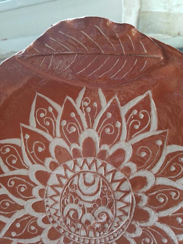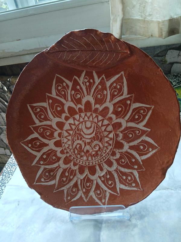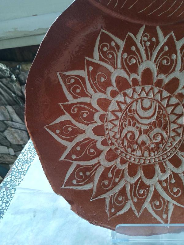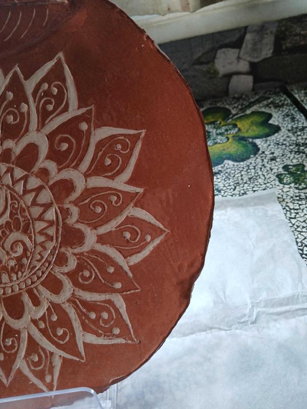 Seramikten kazıma tekniği ile yaptığım dekoratif tabak duvara asmak aparatı olmadığı için duvara asılmaz sadece masa üstü yada vitrin dekoru olarak kullanabilirsiniz ayakla beraber gönderilecektir ölçüleri:(30x30)
