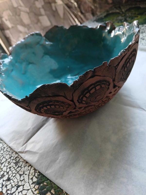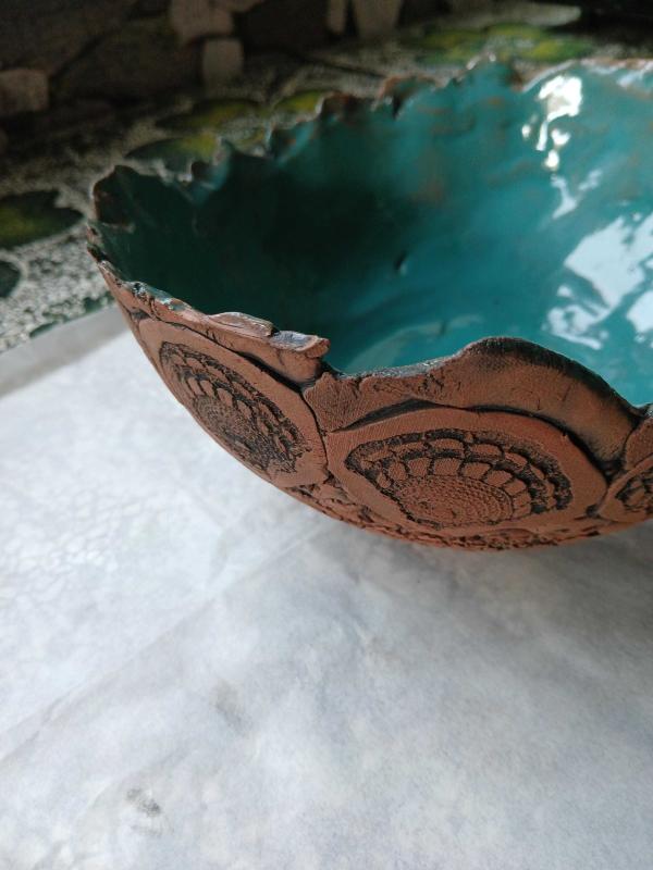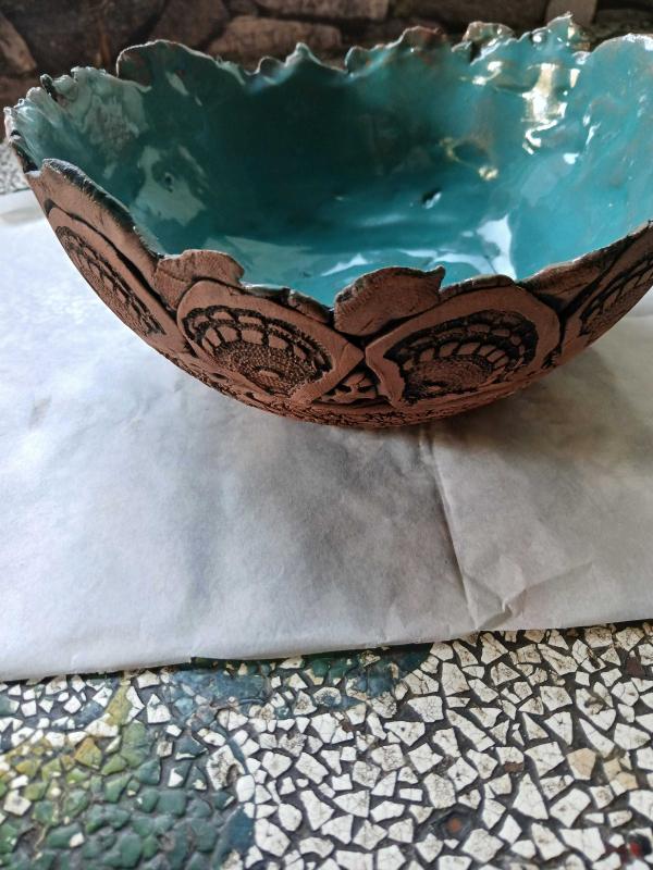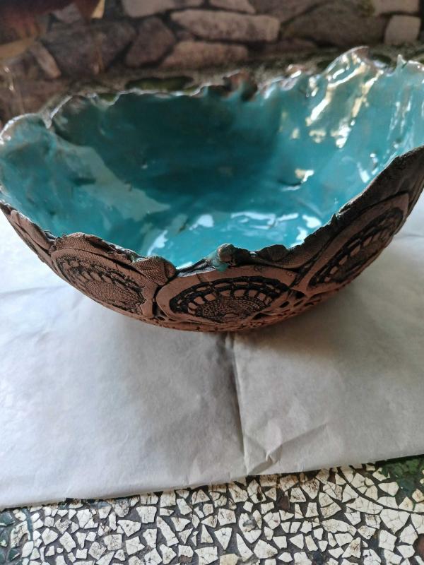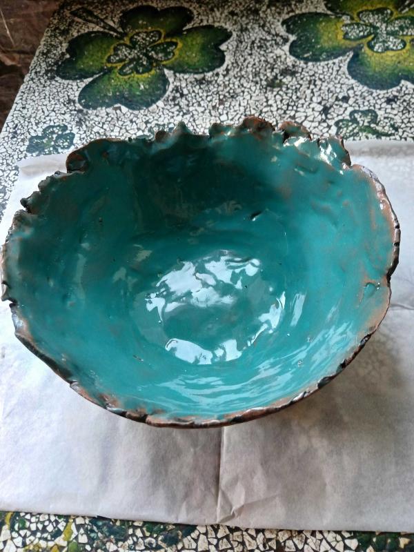 Seramikten yaptığım içi turkuaz renkli sırlandı çerezlik,meyva yada dekoratif amaçlı kullanabilirsiniz ölçüleri:(Genişliği:21cm) (alt taban çapı:13cm) (yükseklik:11x10cm) Alt taban da adımın baş harfleri var.