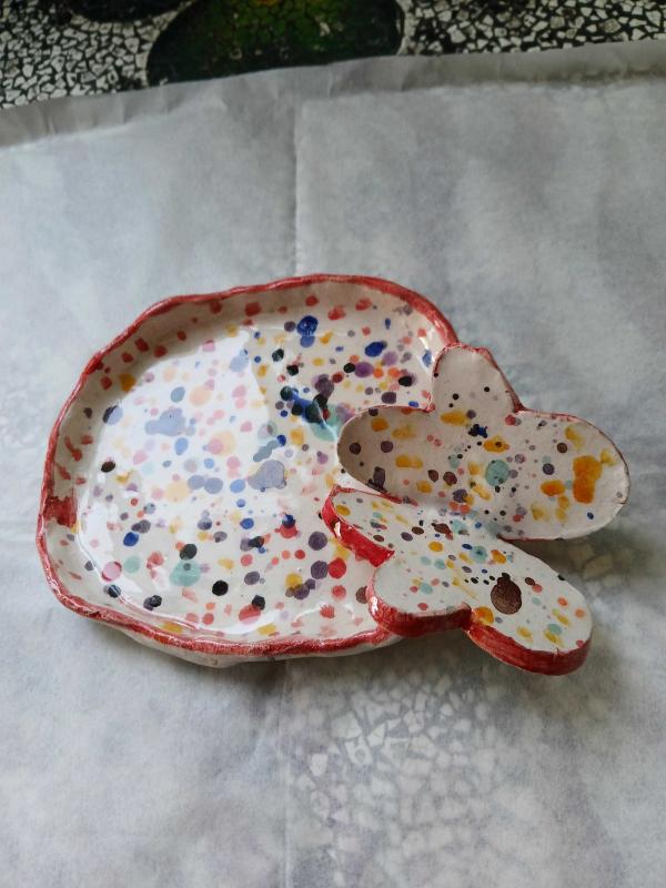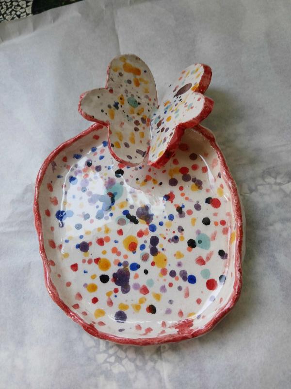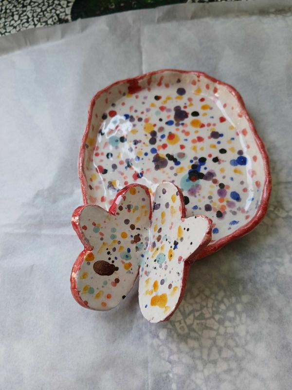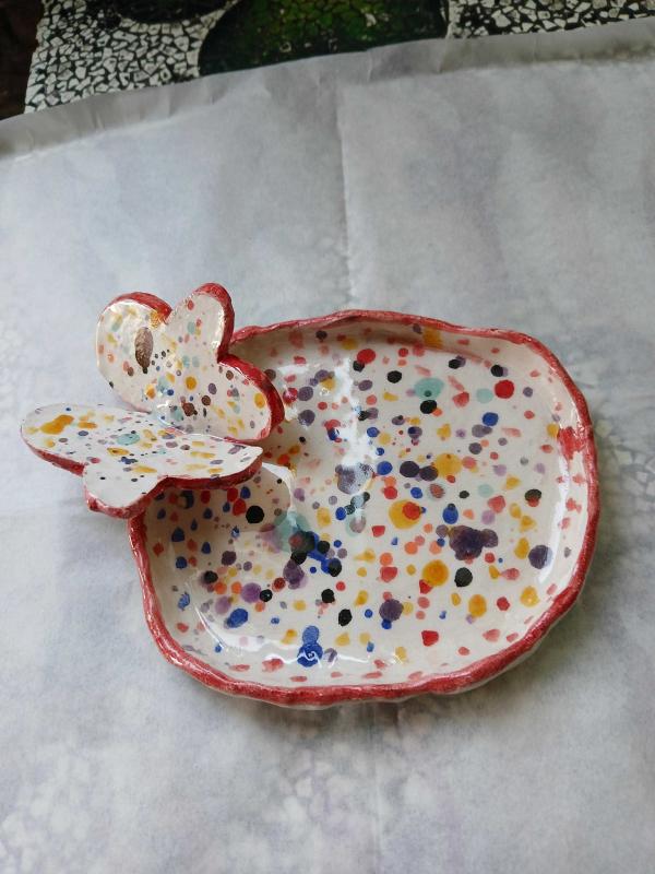 Seramikten yaptığım kelebekli içi puantiyeli içine takılarınızı koyabileceğniz dekoratif tabak ölçüleri:(uzunluk:16cm) (Eni:11cm)