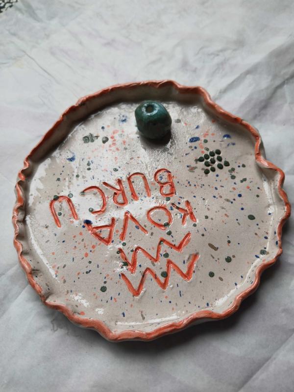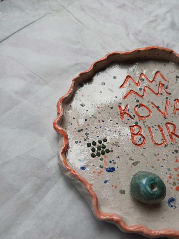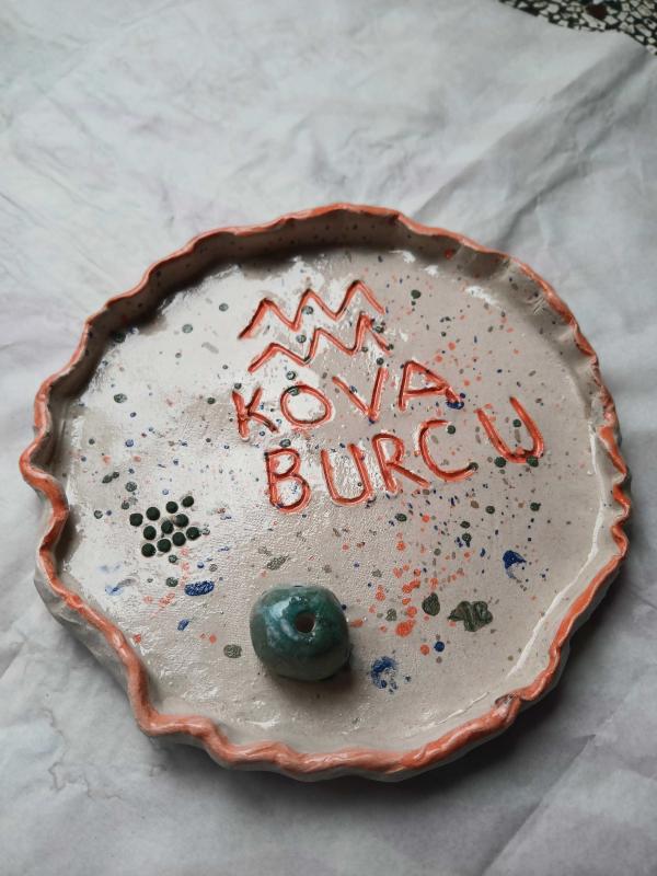 Seramikten yaptığım üzerinde kova burcu simgesi olan sırlanmış dekoratif tabak yada tütsülük olarak kullanabilirsiniz ölçüleri:(14x14)
