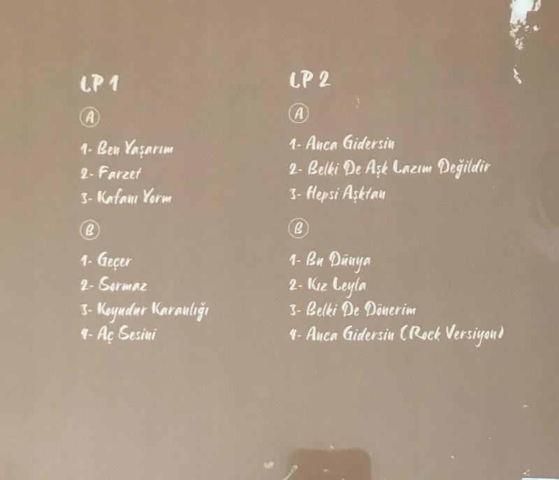 2020 baskı olan plak, şu an tükenmiş baskılardan biridir. - Açılır 400 gram kalın özel tasarım gatefold kapak - 2 x 180 gram plak ağırlığı - 18 bağımsız yağlıboya şarkılara özel tasarımlı mini poster ve illüstrasyonlar - 1.sınıf analog baskı kalitesi, aranılan, değerli bir plaktır. Fotoğrafların hepsi plakların orjinal fotoğraflarıdır. Tüm plaklar özel plak kutusunda, aksi belirtilmedikçe yurtiçi veya aras kargo ile gönderilir. Kondisyon: Ambalajında (S.S) Label: Kala Müzik – none Format: 2 x Vinyl, LP, Album Country: Turkey Released: Nov 2, 2020 Genre: Rock, Pop Style: Ballad Albüm İçeriği; LP: 1 A1. Ben Yaşarım A2. Farz Et A3. Kafanı Yorma B1. Geçer B2. Sormaz B3. Koyudur Karanlığı B4. Aç Sesini LP: 2 C1. Anca Gidersin C2. Belki de Aşk Lazım Değildir C3. Hepsi Aşktan D1. Bu Dünya D2. Kız Leyla D3. Belki de Dönerim D4. Anca Gidersin (Rock Versiyonu)