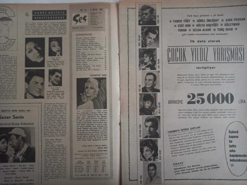 Ses Haftalık Aktüalite Sinema Tiyatro Müzik ve Gençlik Mecmuası Dergisi - 8 Mayıs 1965 - Sayı:19 - Gina Lollobrigida - Sezer Sezin - Tamer Yiğit - Gürel Ünlüsoy - Ajda Pekkan - Ediz Hun - Hülya Koçyiğit - Süleyman Turan - Selda Alkor - Tunç Okan - Ayfer Feray - Pervin Par - Rukiye Göreç - Halit Refiğ - Birsen Menekşeli - Fredric March - Yılmaz Gruda - Rock Hudson - Sadri Alışık - Sevda Ferdağ - Gökçen Kaynatan orkestrası - Sylvie Vartan - Leslie Caron - Warren Beatty - Çetin Köroğlu - İhsan Sanıvar - Ahmet Levendoğlu - Kartal Tibet - Begüm Sayko - Muhittin Yılmazer - Yapı ve Kredi Bankası reklamı - Robert Hossein - Marie France Pisier - Cennette buluşalım filmi fotoromanı - Pareja reklamı fotoğraf ve haberi - Dergi Tam Değildir Sadece 30 Sayfası Mevcuttur Yıpranma, sararmalar, kupon kesiği ve yırtılmalar zamana bağlı olarak görülebilir
