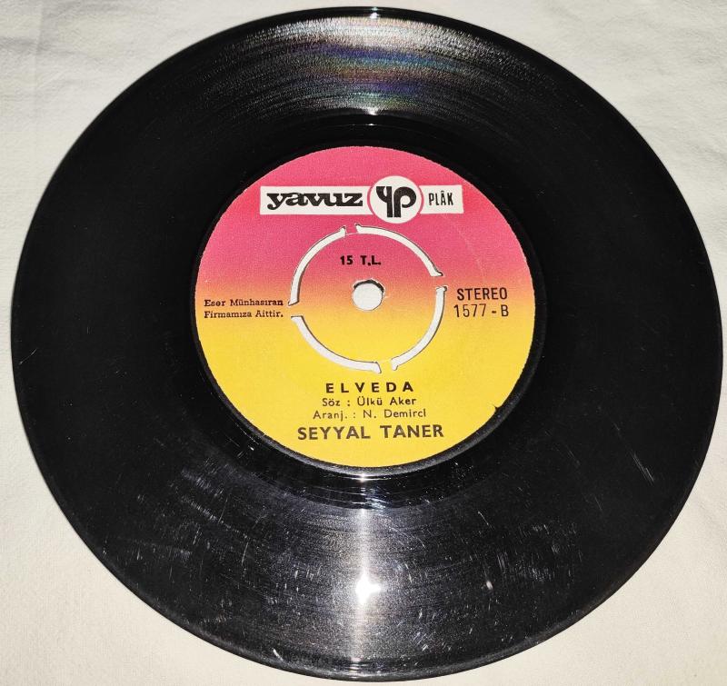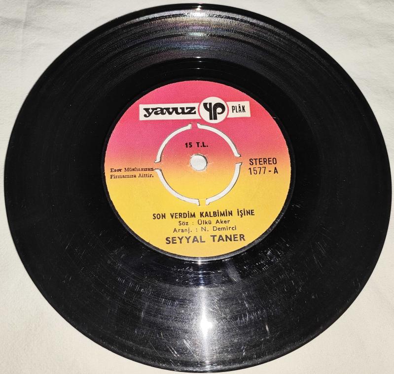 Seyyal Taner Son Verdim Kalbimin İşine / Elveda 45'lik Plak 1976 Baskı Plak Kondisyonu 8/10 Seyyal Taner'in en çok sevilen 45'liği "Son Verdim Kalbimin İşine / Elveda", 1976 tarihli Türkiye baskısıdır. Koleksiyonerler için özel bir parça olan bu 45'lik, orijinal dönem koruma kabıyla arşivinizde yer almayı bekliyor. A Yüzü: Son Verdim Kalbimin İşine B Yüzü: Elveda Ankara'ya elden teslim edilir.