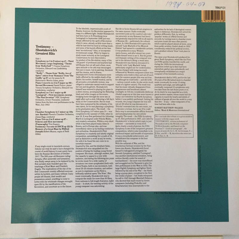 A1 Dmitri Shostakovich– Symphony No. 5 (Excerpt) A2 Dmitri Shostakovich– The Gadfly (Excerpt) A3 Dmitri Shostakovich– Piano Concerto No. 2 (Excerpt) A4 Dmitri Shostakovich– Symphony No. 7 (Excerpt) B1 Dmitri Shostakovich– Chamber Symphony In C Minor B2 Dmitri Shostakovich– Piano Trio No. 2 (Excerpt) B3 Wilfred Josephs– Testimony: Toccata On DSCH (In Memory Of A Great Man)