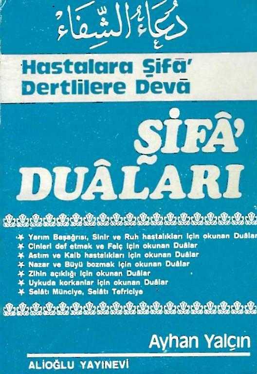 Şifa duaları Hastalara şifa dertlilere deva, Ayhan Yalçın tarafından kaleme alınmıştır. Kitap 1982 yılında Alioğlu Yayınevi tarafından [İstanbul] yayınlanmıştır. 96 sayfadır. Şifa duaları Hastalara şifa dertlilere deva adlı eser Türkçe dilindedir.