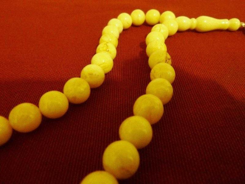 Sıkma kehribar, altın renkli püsküllü 33'lük tesbih. İmame dahil 20cm., en son 1 yıl önce güncellenmiştir.