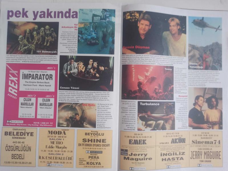 Sinema Gazetesi Haftalık Antrakt Dergisi Eki - 11-17 Nisan 1997 - Sayı:23 - Çılgın Marslılar Filmi - Jack Nicholson - Glenn Close - Annette Bening - Pierce Brosnan - Danny DeVito - Dalgaları Aşmak Filmi - Robby Müller - Tom Cruise Filmi - Jerry Maguire - Gracie Films - Cameron Crowe - Antrakt - Rezervuar Köpekleri - Masumiyet Filmi - Orhon Murat Arıburnu Ödülleri Sahiplerini Buldu - 101 Dalmaçyalı Filmi - Glenn Close - Walt Disney Pictures - Great Oaks - Jeff Daniels - Stephen Herek - Devrim Çocukları Filmi - Geoffrey Rush - Murray Abraham - Peter Duncan - Fargo Filmi - Sinema Salonları - Pek Yakında - Cenaze Töreni Filmi - The Relic Filmi - Sessiz Düşman Filmi - Dante Yanardağı Filmi - Basquiat Filmi - Turbulance Filmi - Devrim Çocukları Filmi - Judy Davis - Sam Neill - Richard Roxburgh - Metro Filmi - Eddie Murphy - Roger Birnbaum - Thomas Carter - Fargo Filmi - Frances McDormand - William H. Macy - Steve Buscemt fotoğraf ve haberi - Tam Takım Dergi Yıpranma, sararmalar, kupon kesiği ve yırtılmalar zamana bağlı olarak görülebilir