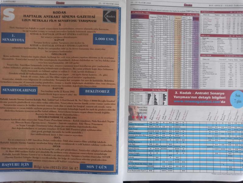 Sinema Gazetesi Haftalık Antrakt Dergisi Eki - 15-21 Kasım 2002 - Sayı:3 - Beatrice Dalle - Can Candan - Yeni Başlayanlar İçin İtalyanca Filmi - Anders Berthelsen - Anette Stovelbaek - Ann Eleonora - Lucy Liu - Türk Sineması 88 Yaşında - Artun Yeres'in Kamerasından Ressamlar - Mr. Deeds Kazara Zengin Filmi - Adam Sandler - Winona Ryder - 'Büyüklere kurt - kuzu masalları'na devam... - Kızıl Ejder Filmi - Anthony Hopkins - Edward Norton - Ralph Fiennes - Harvey Keitel - Dokuz Filmi - Taraf Tutmak Filmi - Balistik Filmi - Beyaz Zakkum Filmi - Michelle Pfeiffer - John Bilingsley - Hergün Başka Bir Bela Filmi - Vincent Gallo - Tricia Vessey - Ankara Uluslararası Film Festivali - Tuncan Okan - Yıldız Tablosu - Sinemalarda Bu Hafta - JBL Hoparlör Reklamı - Benim Karım Artist Filmi - Charlotte Gainsbourg - Yvan Attal fotoğraf ve haberi - Tam Takım Dergi Yıpranma, sararmalar, kupon kesiği ve yırtılmalar zamana bağlı olarak görülebilir