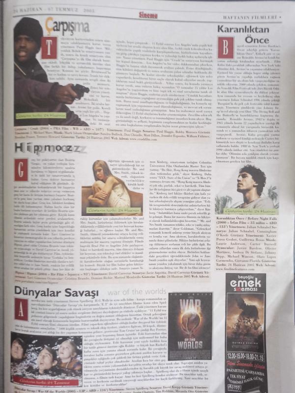 Sinema Gazetesi Haftalık Antrakt Dergisi Eki - 24 Haziran - 7 Temmuz 2005 - Sayı:35-36 - Çarpışma Filmi - Sandra Bullock - Don Cheadle - Matt Dillon - Jennifer Esposito - Brendan Fraser - Vahşi Şeyler 3 Filmi - Sinema Konferansı - Keloğlan Kara Prens'e Karşı - Özgür Şeyben - Türkiye Box Office - Karanlıktan Önce Filmi - Javier Bardem - Olivier Martines - Andrea Di Stefano - Johnny Depp - Michael Wincot - Dünyalar Savaşı Filmi - Tom Cruise - Dakota Fanning - Justin Chatwin - Mipnoz filmi - Cristina Brando - Demian Bichir - Marisol Membrillo - Ev Sineması Keyfi - Haftanın Filmleri - Ayışığında Sinema Keyfi! - Mumya Evi Filmi - Elisha Cuthbert - Chad Michael Murray - Brian Van Holt - Paris Hilton - Jared Padalecki fotoğraf ve haberi - Tam Takım Dergi Yıpranma, sararmalar, kupon kesiği ve yırtılmalar zamana bağlı olarak görülebilir