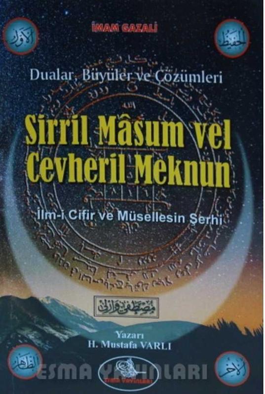 Sirril Masum Vel Cevheril Meknun. Dualar, Büyüler ve Çözümleri. Define ve Korunma [Havas; Havass], Gazali tarafından kaleme alınmıştır. Eser Mustafa Varlı editörlüğünde hazırlanmıştır. Kitap Esma Yayınları tarafından [İstanbul] yayınlanmıştır. Satışta olan kitap, yayınevinin 1. baskısıdır. 384 sayfadır. Sirril Masum Vel Cevheril Meknun. Dualar, Büyüler ve Çözümleri. Define ve Korunma [Havas; Havass] adlı eser Türkçe dilindedir. Eserin içeriğinde Türkçe dilinde bölümlere de yer verilmektedir.