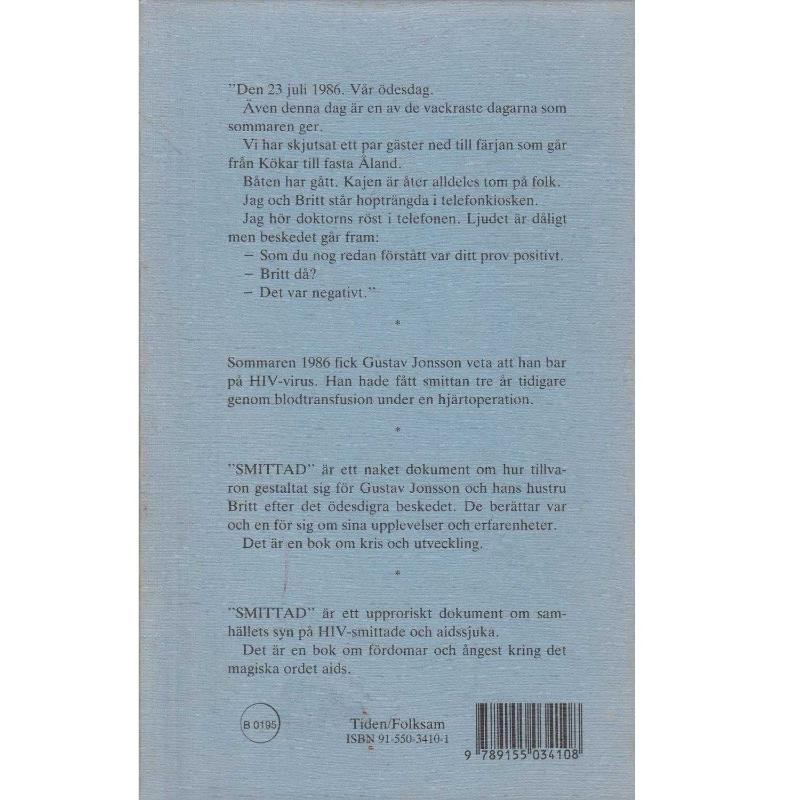Smittad: Ett Personligt Dokument(İkinciel Kullanılmış Kitap), av Gustav Jonsson och Britt Jonsson tarafından kaleme alınmıştır. Kitap 1988 yılında Tidens Förlag tarafından [Stockholm] 9789155034108 ISBN kodu ile yayınlanmıştır. Satışta olan kitap, yayınevinin 1. baskısıdır. 122 sayfadır. Smittad: Ett Personligt Dokument(İkinciel Kullanılmış Kitap) adlı eser İsveççe dilindedir.