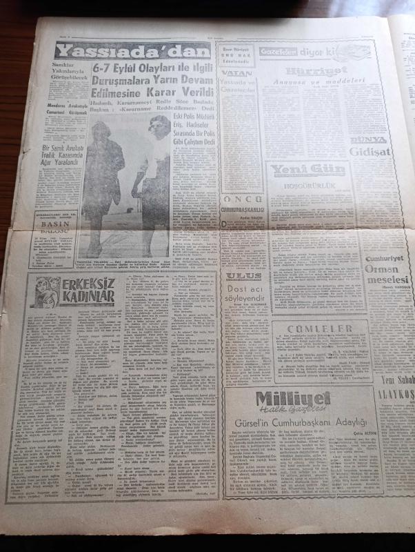 Son Dakika Gazetesi - 20 Ekim 1960 - Zeki Müren-Yassıada Duruşmalarında 4. Gün - Duruşmaların Bu Sabahki Tafsilatı - Köpek Davası Karara Kaldı - Bülent Üçer Suç Varsa Celal Bayar'a Aittir - Arif Hikmet Yamanoğlu Hayatımın En Mühim Müdafaasını Yapıyorum Dedi - 6 7 Eylül Olaylarına Ait Duruşmalara Yarından İtibaren Devam Edilecek - 6 7 Eylül Duruşmalarında Celal Bayar Adnan Menderes Fatin Rüştü Zorlu Fuat Köprülü Fotoğraf - Fahrettin Kerim Gökay'ın Konuşması - Fatin Rüştü Zorlu'nun Konuşması - Mucizeler Yaratan Adam Yazan Hikmet Saim Yazı Dizisi - Hayatımdaki Erkekler Marilyn Monroe Anlatıyor Yazı Dizisi - Dünyayı Titreten Türk Yavuz Sultan Selim Yazan Murat Sertoğlu Yazı Dizisi - Adnan Menderes Avukatıyla Cumartesi Görüşecek - Erkeksiz Kadınlar Yazı Dizisi - Fenerbahçe Bu Akşam Geliyor - A ve B Milli Takımlar Lağvedildi Kadrolar Yeni Baştan Seçilecek - Milli Güreşçimiz Mustafa Kurt Tevkif Edildi - Ankaragücünü Bu Sabah Sabri Kiraz Çalıştırdı, Ömer Kadri Sabırlı tarafından kaleme alınmıştır. Son Dakika Gazetesi - 20 Ekim 1960 - Zeki Müren-Yassıada Duruşmalarında 4. Gün - Duruşmaların Bu Sabahki Tafsilatı - Köpek Davası Karara Kaldı - Bülent Üçer Suç Varsa Celal Bayar'a Aittir - Arif Hikmet Yamanoğlu Hayatımın En Mühim Müdafaasını Yapıyorum Dedi - 6 7 Eylül Olaylarına Ait Duruşmalara Yarından İtibaren Devam Edilecek - 6 7 Eylül Duruşmalarında Celal Bayar Adnan Menderes Fatin Rüştü Zorlu Fuat Köprülü Fotoğraf - Fahrettin Kerim Gökay'ın Konuşması - Fatin Rüştü Zorlu'nun Konuşması - Mucizeler Yaratan Adam Yazan Hikmet Saim Yazı Dizisi - Hayatımdaki Erkekler Marilyn Monroe Anlatıyor Yazı Dizisi - Dünyayı Titreten Türk Yavuz Sultan Selim Yazan Murat Sertoğlu Yazı Dizisi - Adnan Menderes Avukatıyla Cumartesi Görüşecek - Erkeksiz Kadınlar Yazı Dizisi - Fenerbahçe Bu Akşam Geliyor - A ve B Milli Takımlar Lağvedildi Kadrolar Yeni Baştan Seçilecek - Milli Güreşçimiz Mustafa Kurt Tevkif Edildi - Ankaragücünü Bu Sabah Sabri Kiraz Çalıştırdı adlı eser Türkçe dilindedir.