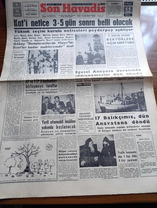 Son Havadis Gazetesi - 11 Temmuz 1961 - Anayasa İçin Halk Oylamasında Kati Netice 3 5 Gün Sonra Belli Olacak - Adalet Partisi Ve Yeni Türkiye Partisi İl Başkanlarının Birleşmeye Taraftar - Cumhuriyetçi Köylü Millet Partisi Hayır Propagandası Yapan Parti Mensuplarını Tesbit Ediyor - Altay Ömer Egesel Anayasa Davasında İddianamesini Dün Okudu - 17 Balıkçımız Dün Anavatanı Döndü - 3. Dünya Harbinin İçindeyiz Yazan Nejat Arıkan Yazı Dizisi - Eşsiz Bulutlar Yazan Françoise Sagan Yazı Dizisi - Türkiye'de Komünist Hareketleri Hazırlayan İlhan Darendelioğlu Yazı Dizisi - Bir EMİNSU Daha CHP'den İstifa Etti - Bozkurtların Ölümü Yazan Nihal Atsız - Annette Vittorio Gasman'la Evleniyor - Vizonlu Venüs Yazan John O'Hara Yazı Dizisi - Paris Celladı Yazan A. M. Mons Yazı Dizisi - Suat Mamat Galatasaray'da Kalacağım - Metin Oktay Dün Mukavele Yaptı - Hakkı Yeten'in Beyanatı - Rüştü Dağlaroğlu - Arı Hafiye Çizen Harry Smith - Dümenço Çizgi Roman Çizen Yurdagün - Tahta Bacak Çizgi Roman adlı eser, Kitap > Süreli Yayınlar > Gazeteler > Türkiye > Genel > Günlük kategorisinde İkinci El olarak satıştadır.