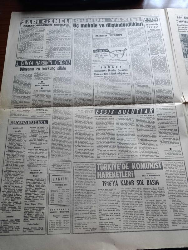 Son Havadis Gazetesi - 11 Temmuz 1961 - Anayasa İçin Halk Oylamasında Kati Netice 3 5 Gün Sonra Belli Olacak - Adalet Partisi Ve Yeni Türkiye Partisi İl Başkanlarının Birleşmeye Taraftar - Cumhuriyetçi Köylü Millet Partisi Hayır Propagandası Yapan Parti Mensuplarını Tesbit Ediyor - Altay Ömer Egesel Anayasa Davasında İddianamesini Dün Okudu - 17 Balıkçımız Dün Anavatanı Döndü - 3. Dünya Harbinin İçindeyiz Yazan Nejat Arıkan Yazı Dizisi - Eşsiz Bulutlar Yazan Françoise Sagan Yazı Dizisi - Türkiye'de Komünist Hareketleri Hazırlayan İlhan Darendelioğlu Yazı Dizisi - Bir EMİNSU Daha CHP'den İstifa Etti - Bozkurtların Ölümü Yazan Nihal Atsız - Annette Vittorio Gasman'la Evleniyor - Vizonlu Venüs Yazan John O'Hara Yazı Dizisi - Paris Celladı Yazan A. M. Mons Yazı Dizisi - Suat Mamat Galatasaray'da Kalacağım - Metin Oktay Dün Mukavele Yaptı - Hakkı Yeten'in Beyanatı - Rüştü Dağlaroğlu - Arı Hafiye Çizen Harry Smith - Dümenço Çizgi Roman Çizen Yurdagün - Tahta Bacak Çizgi Roman, M. Kemal Pekün tarafından kaleme alınmıştır. Son Havadis Gazetesi - 11 Temmuz 1961 - Anayasa İçin Halk Oylamasında Kati Netice 3 5 Gün Sonra Belli Olacak - Adalet Partisi Ve Yeni Türkiye Partisi İl Başkanlarının Birleşmeye Taraftar - Cumhuriyetçi Köylü Millet Partisi Hayır Propagandası Yapan Parti Mensuplarını Tesbit Ediyor - Altay Ömer Egesel Anayasa Davasında İddianamesini Dün Okudu - 17 Balıkçımız Dün Anavatanı Döndü - 3. Dünya Harbinin İçindeyiz Yazan Nejat Arıkan Yazı Dizisi - Eşsiz Bulutlar Yazan Françoise Sagan Yazı Dizisi - Türkiye'de Komünist Hareketleri Hazırlayan İlhan Darendelioğlu Yazı Dizisi - Bir EMİNSU Daha CHP'den İstifa Etti - Bozkurtların Ölümü Yazan Nihal Atsız - Annette Vittorio Gasman'la Evleniyor - Vizonlu Venüs Yazan John O'Hara Yazı Dizisi - Paris Celladı Yazan A. M. Mons Yazı Dizisi - Suat Mamat Galatasaray'da Kalacağım - Metin Oktay Dün Mukavele Yaptı - Hakkı Yeten'in Beyanatı - Rüştü Dağlaroğlu - Arı Hafiye Çizen Harry Smith - Dümenço Çizgi Roman Çizen Yurdagün - Tahta Bacak Çizgi Roman adlı eser Türkçe dilindedir.
