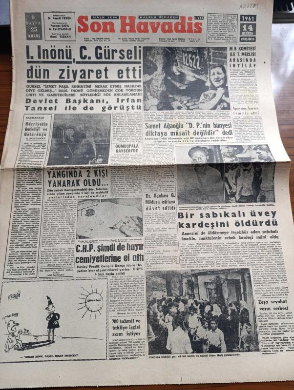 Son Havadis Gazetesi - 14 Haziran 1961 - Hürriyetin Getirdiği Ve Götürdüğü Yazan Gökhan Evliyaoğlu Köşe Yazısı - İsmet İnönü Cemal Gürsel'i Dün Ziyaret Etti - Samet Ağaoğlu Demokrat Parti'nin Bünyesi Diktaya Müsait Değildir Dedi - Ragıp Gümüşpala Kayseri'de - CHP Şimdi De Hayır Cemiyetlerine El Attı - Sarı Çizmeli Yazan Adviye Fenik - İmamı Azam Ve Hanefi Mezhebi Yazan Ragıp Akyavaş - Türkiye'de Komünist Hareketleri Hazırlayan İlhan Darendelioğlu - Fidel Castro Ve Esirleri - Kızıl Diktatör Fidel Castro Esirleri 500 Traktöre Mukabil Serbest Bırakacak - Bozkurtların Ölümü Yazan Nihal Atsız - 500 Müslüman Lider Haklarını İstiyor - Basından Özetler - Papa Belçika Kraliçesi Fabiola'nın Hamile Olduğunu Açıkladı - Yassıada'da Pazartesi Günü Yapılan Duruşma - Galatasaray'da Borç 584 Bin Lira - Arı Hafiye Çizen Harry Smith - Tahta Bacak Çizgi Roman - Dümenço Çizgi Roman Çizen Yurdagün - İzmirspor'un Kurt İdarecisi Sami Özok Bizden Futbolcu Alan Zararlı Çıkar Dedi - Beşiktaş Everton Maçı Bugün adlı eser, Kitap > Süreli Yayınlar > Gazeteler > Türkiye > Genel > Günlük kategorisinde İkinci El olarak satıştadır.