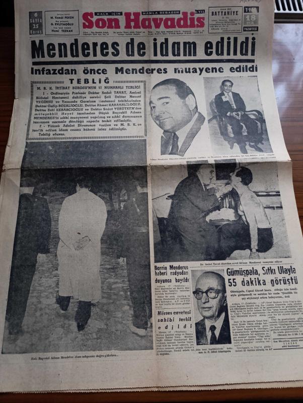 Son Havadis Gazetesi - 18 Eylül 1961 - Adnan Menderes De İdam Edildi Fotoğraf - İnfazdan Önce Adnan Menderes Muayene Edildi Fotoğraf - Milli Birlik Komitesi İrtibat Bürosunun 61 Numaralı Tebliği - Eski Başvekil Adnan Menderes İdam Sehpasına Doğru Giderken Fotoğraf - Adnan Menderes İdam Edilmeden Bir Kaç Dakika Evvel - Ragıp Gümüşpala Sıtkı Ulay'la 55 Dakika Görüştü - Hürses Gazetesi Sahibi Rahmi Yalın Tevkif Edildi - Türkiye'de Komünist Hareketleri Hazırlayan İlhan Darendelioğlu Yazı Dizisi - Tevfik Fikret ve Hürriyet Yazan Faruk K. Timurtaş - Meksika'da Ayaklanma Bastırıldı - Bozkurtların Ölümü Yazan Nihal Atsız - Yaman Pilot Çizen Sdyney Jordan - Arı Hafiye Çizen Harry Smith - Paris Celladı Yazan H. M. Mons Yazı Dizisi - Bugünkü Burç Falınız - İstanbul Ankara Radyosu Programı - Irak'ta Kürt İhtilali Tehlikeli Bir Hal Alıyor - Seyfi Kurtbek Adalet Partisi Senato Adayı - 2 İnkılap Aleyhtarı Yakalandı - Beşiktaş Dün De Karagümrük Önünde Boyun Eğip Yenildi - Lefter Küçükandonyadis adlı eser, Kitap > Süreli Yayınlar > Gazeteler > Türkiye > Genel > Günlük kategorisinde İkinci El olarak satıştadır.