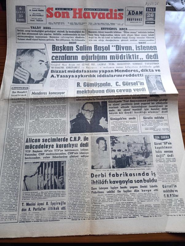 Son Havadis Gazetesi - 26 Temmuz 1961 - Son Havadis'i Kapattırmak İsteyenler Yazan Gökhan Evliyaoğlu Köşe Yazısı - Talat Asal Konuşması - Ertuğrul Akça Konuşması - Başkan Salim Başol Divan İstenen Cezaların Ağırlığını Müdriktir Dedi - Bizzat Müdafaasını Yapan Adnan Menderes Dikta Ve Anayasa Ayrılık İddialarını Reddetti - Ragıp Gümüşpala Cemal Gürsel'in Mektubuna Dün Cevap Verdi - Cemal Gürsel'in Mektubu - Ekrem Alican Seçimlerde CHP ile Mücadeleye Kararlıyız Dedi - Derbi Fabrikasında İş İhtilafı Kavgayla Son buldu - Cemal Gürsel Adalet Partisinin Kapatılması Bahis Mevzuu Değil Dedi - Türkiye'de Komünist Hareketleri Hazırlayan İlhan Darendelioğlu Yazı - Sabahattin Ali Sahnede - Türkistan Birliği Yayınları Yazan Ziyaeddin Babakurban - Zeynep Kamil'de Doğanların Bayramı - Bozkurtların Ölümü Yazan Nihal Atsız - Adnan Menderes'in Avukatı Talat Asal'ın Müdafaası - Nurmetal Çamaşır Makineleri - CHP'li Avni Doğanın Aldığı Para - Altay Ömer Egesel Söz Alıyor, M. Kemal Pekün tarafından kaleme alınmıştır. Son Havadis Gazetesi - 26 Temmuz 1961 - Son Havadis'i Kapattırmak İsteyenler Yazan Gökhan Evliyaoğlu Köşe Yazısı - Talat Asal Konuşması - Ertuğrul Akça Konuşması - Başkan Salim Başol Divan İstenen Cezaların Ağırlığını Müdriktir Dedi - Bizzat Müdafaasını Yapan Adnan Menderes Dikta Ve Anayasa Ayrılık İddialarını Reddetti - Ragıp Gümüşpala Cemal Gürsel'in Mektubuna Dün Cevap Verdi - Cemal Gürsel'in Mektubu - Ekrem Alican Seçimlerde CHP ile Mücadeleye Kararlıyız Dedi - Derbi Fabrikasında İş İhtilafı Kavgayla Son buldu - Cemal Gürsel Adalet Partisinin Kapatılması Bahis Mevzuu Değil Dedi - Türkiye'de Komünist Hareketleri Hazırlayan İlhan Darendelioğlu Yazı - Sabahattin Ali Sahnede - Türkistan Birliği Yayınları Yazan Ziyaeddin Babakurban - Zeynep Kamil'de Doğanların Bayramı - Bozkurtların Ölümü Yazan Nihal Atsız - Adnan Menderes'in Avukatı Talat Asal'ın Müdafaası - Nurmetal Çamaşır Makineleri - CHP'li Avni Doğanın Aldığı Para - Altay Ömer Egesel Söz Alıyor adlı eser Türkçe dilindedir.
