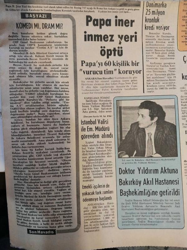 Son Havadis Gazetesi, 29 Kasım 1979 Tarihli, Papa'nın Türkiye Ziyareti Manşetli.