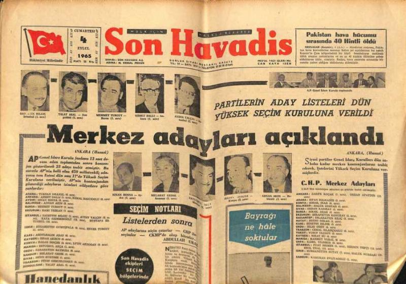 Son Havadis Gazetesi 4 Eylül 1965 - Partilerin Aday Listeleri Dün Yüksek Seçim Kuruluna Verildi GZ65778, en son 20 gün önce güncellenmiştir.