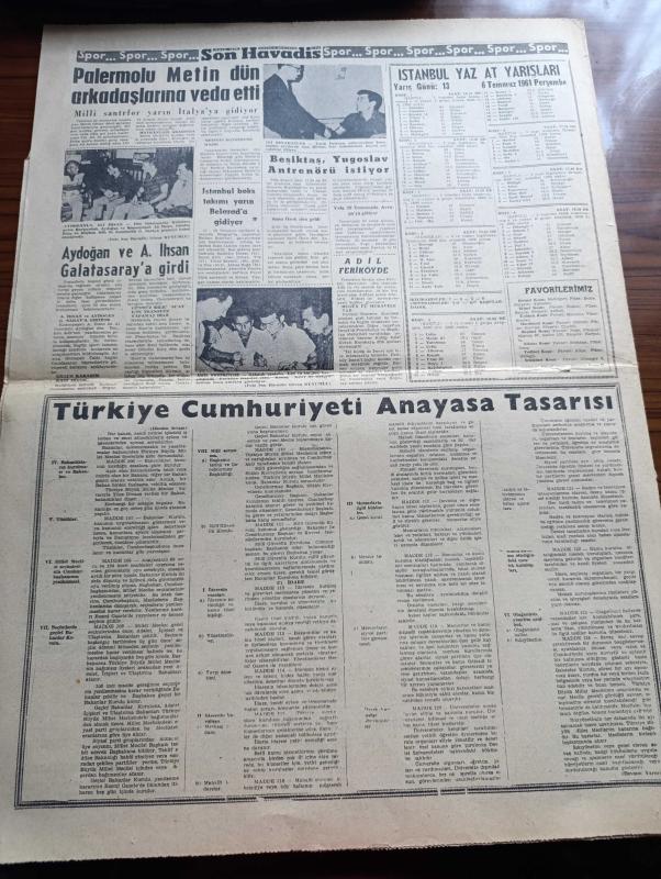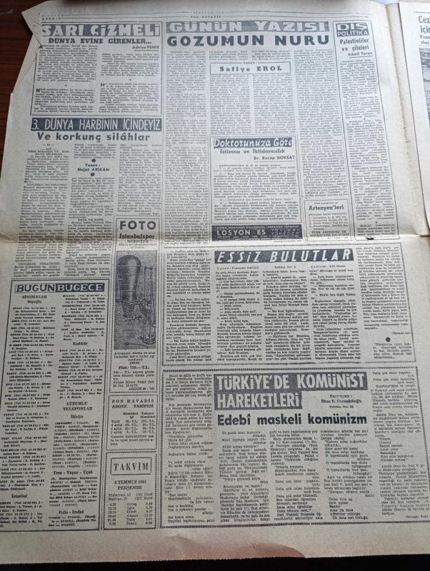 Son Havadis Gazetesi - 6 Temmuz 1961 - Bugün Dahil 3 Gün Siyasi Propaganda Yasak - Oy Sandıkları Başında Resmi Üniforma İle Bulunulmayacak - Fırıncılar Ekmeğe De Zam İstiyor - Kemal Kurdaş Korkuya Kapılıp Enflasyona Gitmeyeceğiz Dedi - Bulgar Casusu Yusuf Hocaoğlu Evvelce CHP Üyesi İmiş - Üç Kübalı Pilot Amerika'ya Kaçtı - Rektör Seçimleri İçin Bazı Öğretim Üyeleri Danıştaya Başvuracak - 3. Dünya Harbinin İçindeyiz Yazan Nejat Arıkan Yazı Dizisi - Eşsiz Bulutlar Yazan Françoise Sağan Yazı Dizisi - Türkiye'de Komünist Hareketleri Hazırlayan İlhan Darendelioğlu Yazı Dizisi - Cezayir'in Taksimine Mani Olmak İçin Müslümanlar Grev Yapıyor - General Mc. Arthur Manila'da Konuştu - Kuveyt Maliye Bakanı Kral Suud İle Görüşecek - Moskova Radyosu 10 Ay Önceki Haberleri Veriyor - Bozkurtların Ölümü Yazan Nihal Atsız - Fidel Castro'nun Kardeşi Raul Castro Suikastta Yaralandı - İsrail Bir Füze Fırlattı - Vizonlu Venüs Yazan John O'Hara Yazı Dizisi - En Çok Para Kazanan Aktristi Elizabeth Taylor -, M. Kemal Pekün tarafından kaleme alınmıştır. Son Havadis Gazetesi - 6 Temmuz 1961 - Bugün Dahil 3 Gün Siyasi Propaganda Yasak - Oy Sandıkları Başında Resmi Üniforma İle Bulunulmayacak - Fırıncılar Ekmeğe De Zam İstiyor - Kemal Kurdaş Korkuya Kapılıp Enflasyona Gitmeyeceğiz Dedi - Bulgar Casusu Yusuf Hocaoğlu Evvelce CHP Üyesi İmiş - Üç Kübalı Pilot Amerika'ya Kaçtı - Rektör Seçimleri İçin Bazı Öğretim Üyeleri Danıştaya Başvuracak - 3. Dünya Harbinin İçindeyiz Yazan Nejat Arıkan Yazı Dizisi - Eşsiz Bulutlar Yazan Françoise Sağan Yazı Dizisi - Türkiye'de Komünist Hareketleri Hazırlayan İlhan Darendelioğlu Yazı Dizisi - Cezayir'in Taksimine Mani Olmak İçin Müslümanlar Grev Yapıyor - General Mc. Arthur Manila'da Konuştu - Kuveyt Maliye Bakanı Kral Suud İle Görüşecek - Moskova Radyosu 10 Ay Önceki Haberleri Veriyor - Bozkurtların Ölümü Yazan Nihal Atsız - Fidel Castro'nun Kardeşi Raul Castro Suikastta Yaralandı - İsrail Bir Füze Fırlattı - Vizonlu Venüs Yazan John O'Hara Yazı Dizisi - En Çok Para Kazanan Aktristi Elizabeth Taylor - adlı eser Türkçe dilindedir.